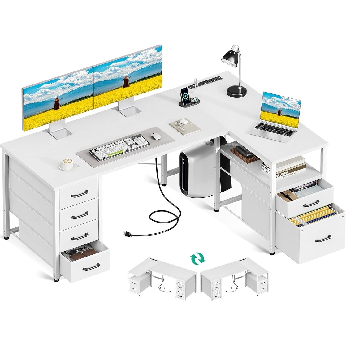L-Shaped Computer Desk with 6 Drawers, Power Outlet & Storage Shelf, 55 Inch Reversible Corner Office Desk, White