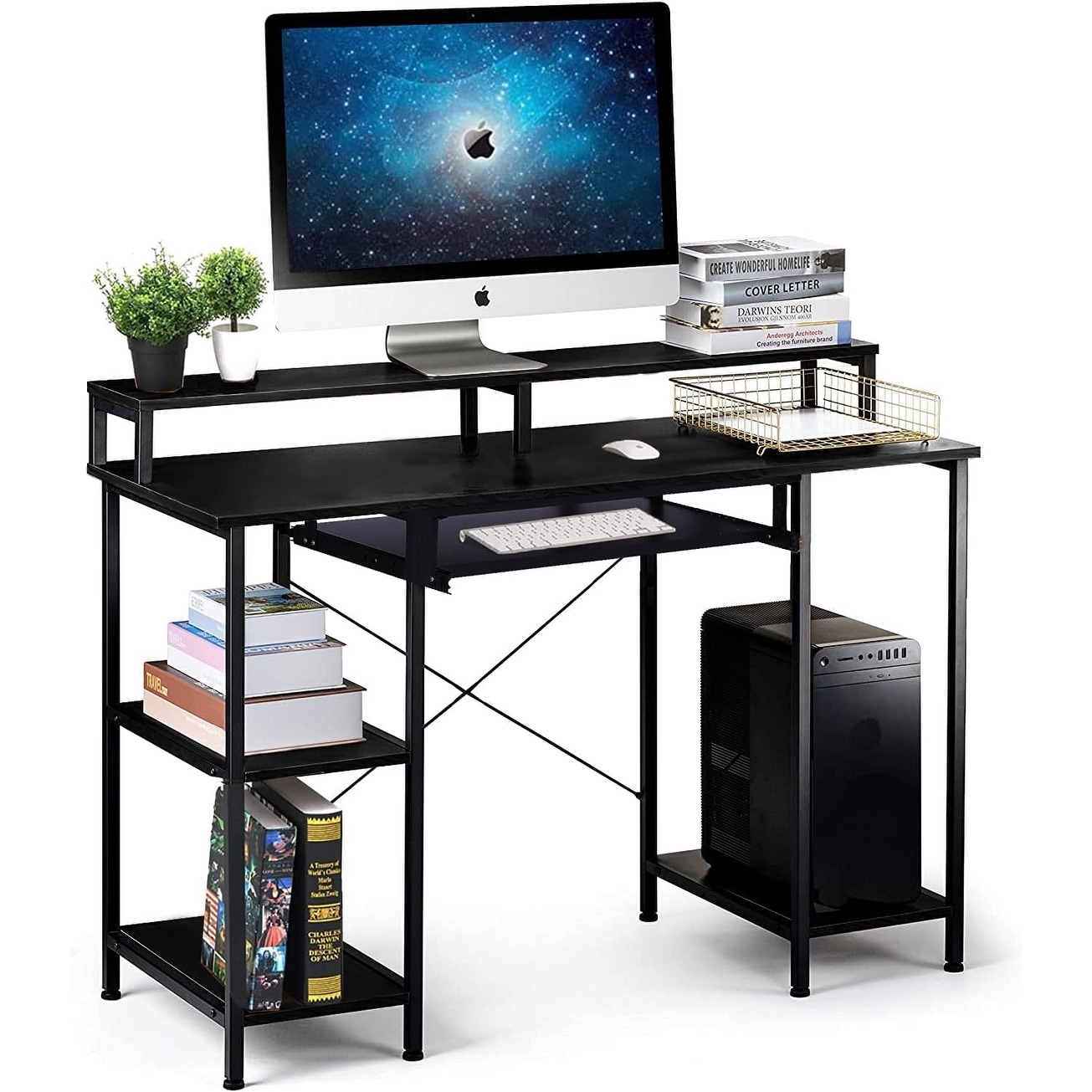 46 inch Modern Computer Desk with Monitor Stand and Storage Shelves, Black Study Work Desk for Home Office