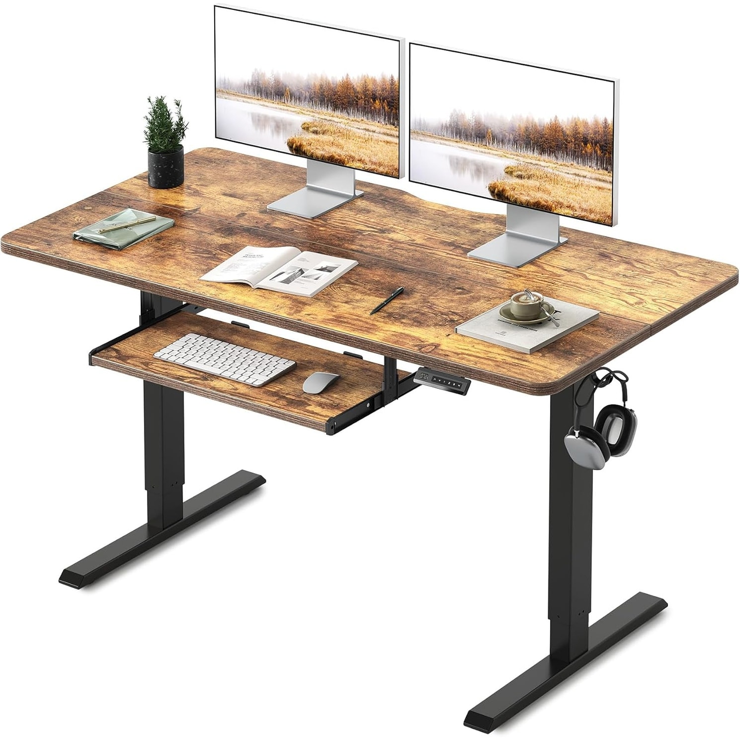 Adjustable Height Sit Stand Desk with Keyboard Tray, Ergonomic Workstation, Rustic Brown