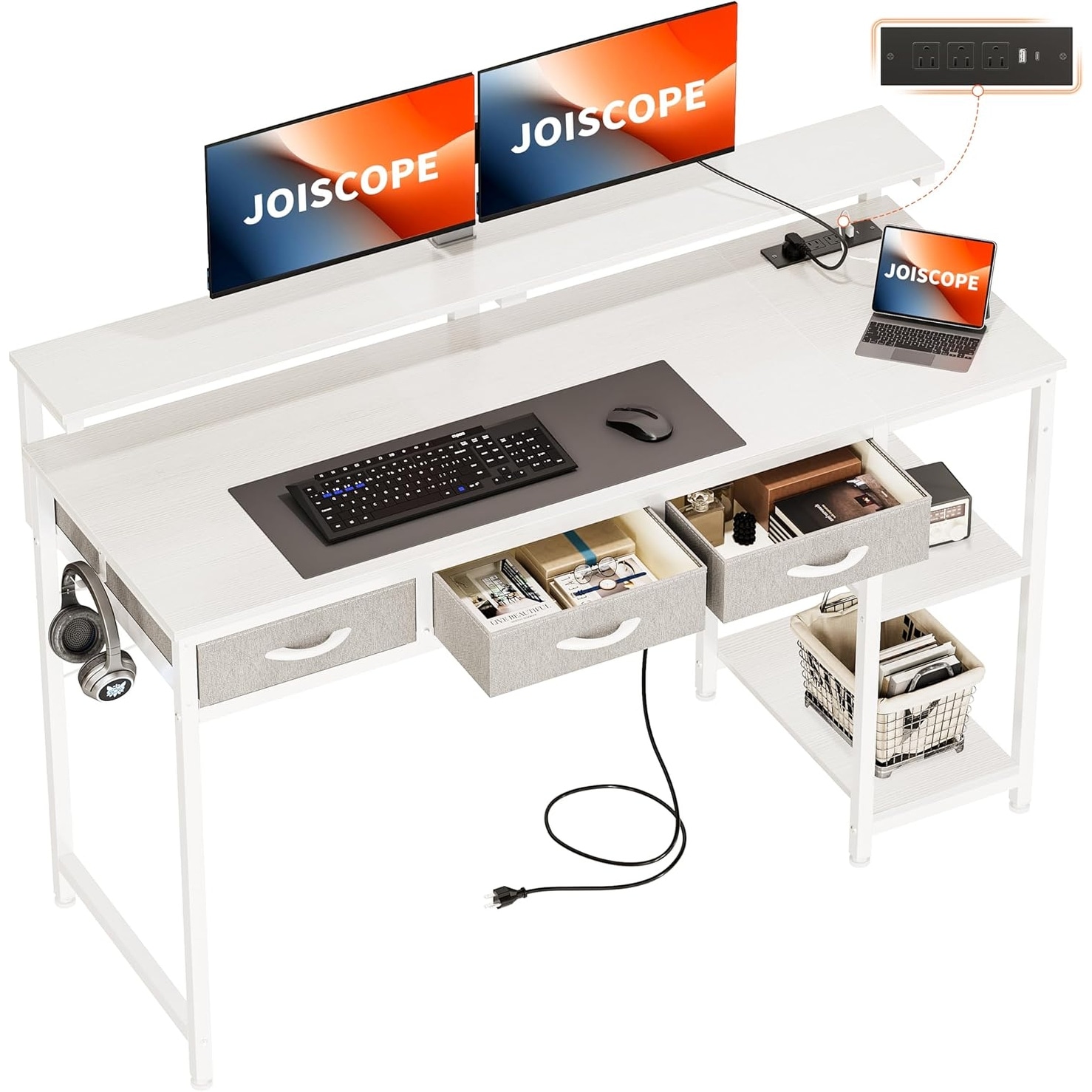Home Office Desk with Power Outlets, 55 × 20 Inch Computer Desk with Drawers & Shelves, Gaming Study Drafting Table, White