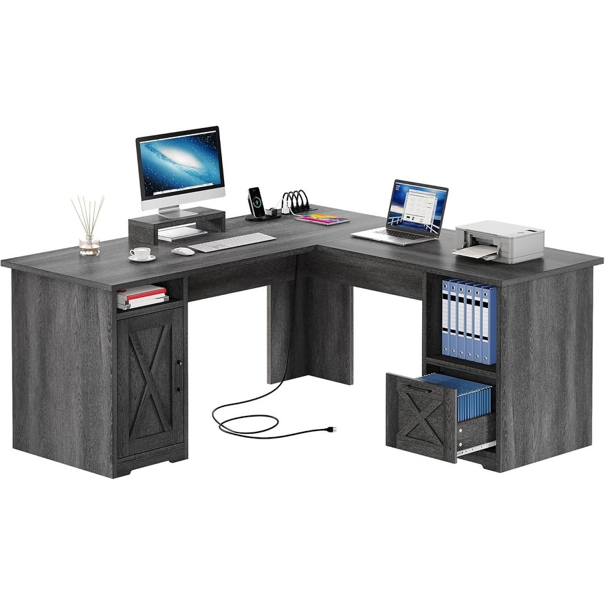L-Shaped Desk with Power Outlets, 60 Inch Corner Desk with Drawer, Monitor Stand & Storage Shelves, Grey