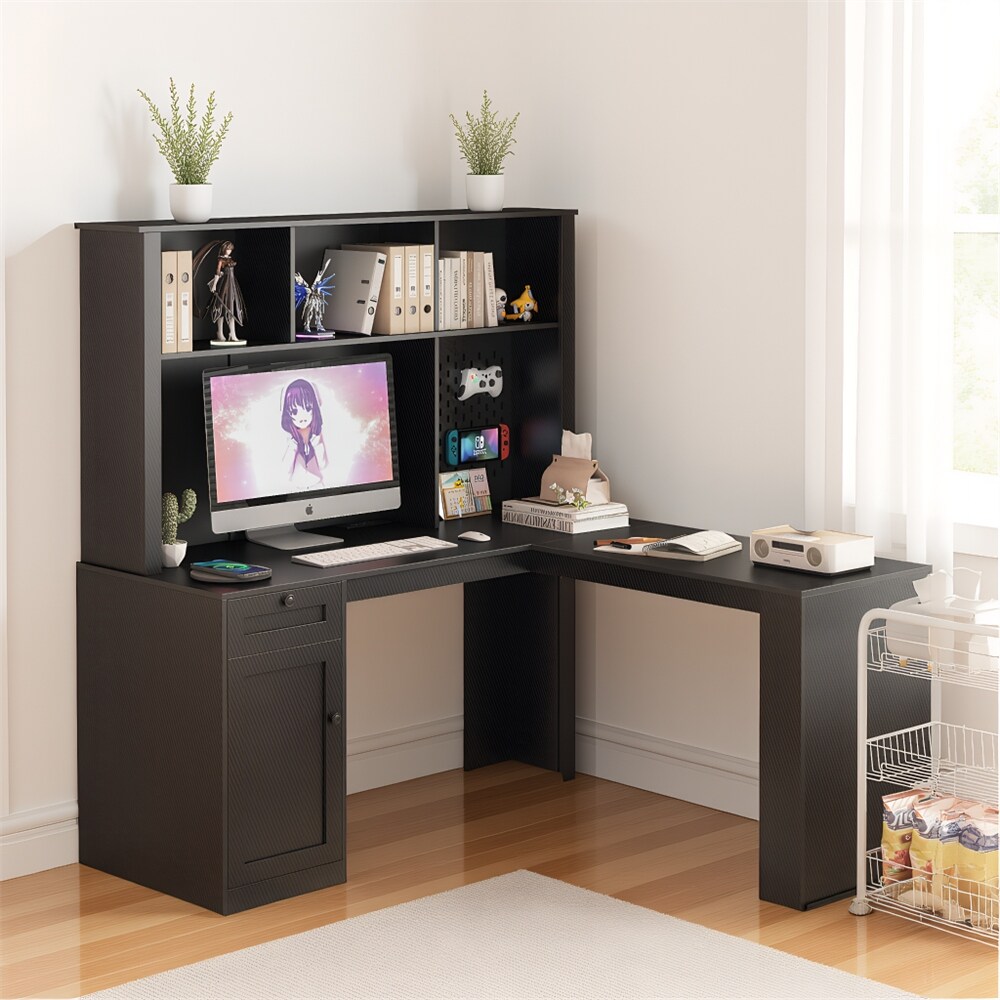 L Shaped Desk with Charger,Computer Desk with Drawers,Bookshelf