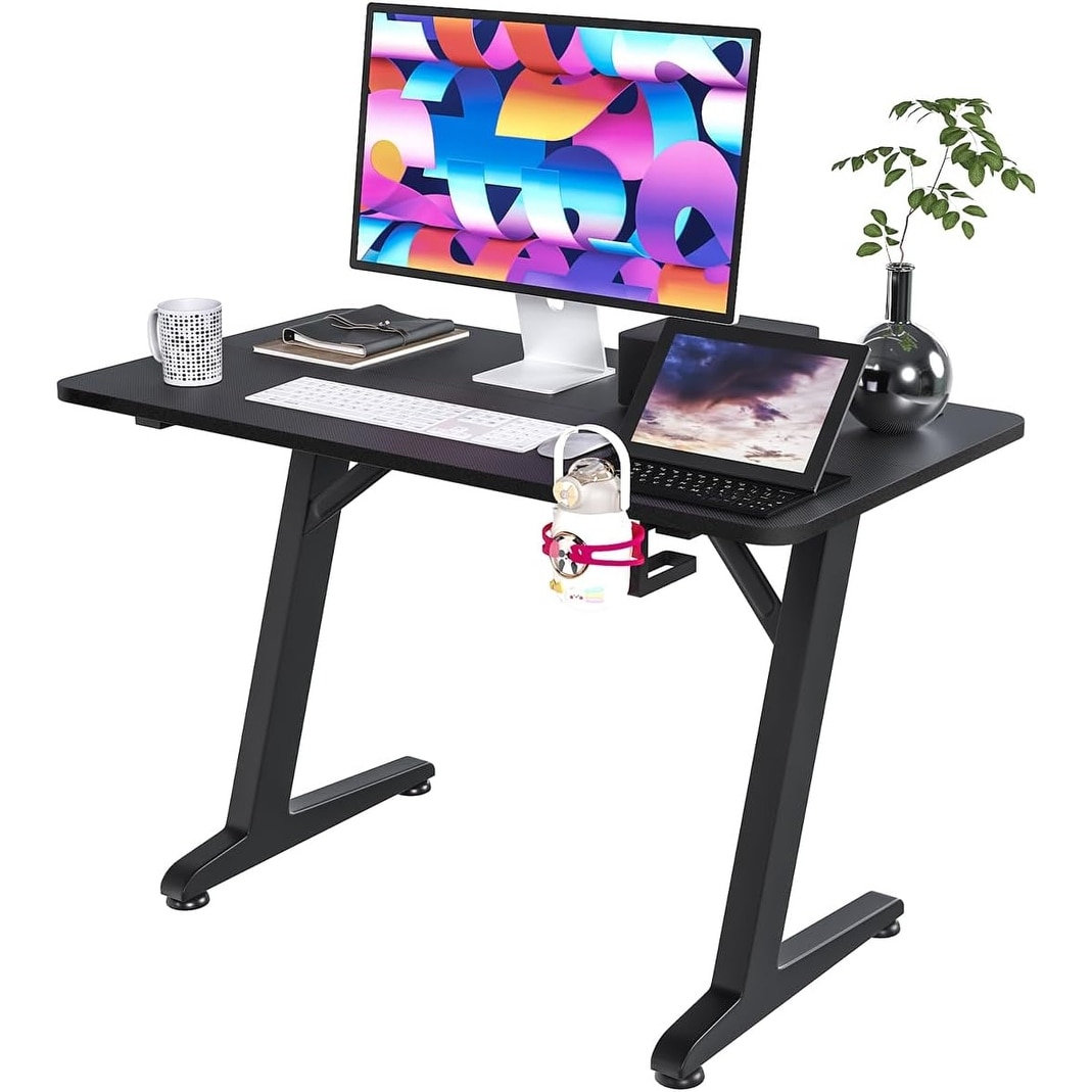 44 Inch Wide Ergonomic Z-Shaped Gaming Desk with Carbon Fiber Surface, Drink Holder & Wire Management