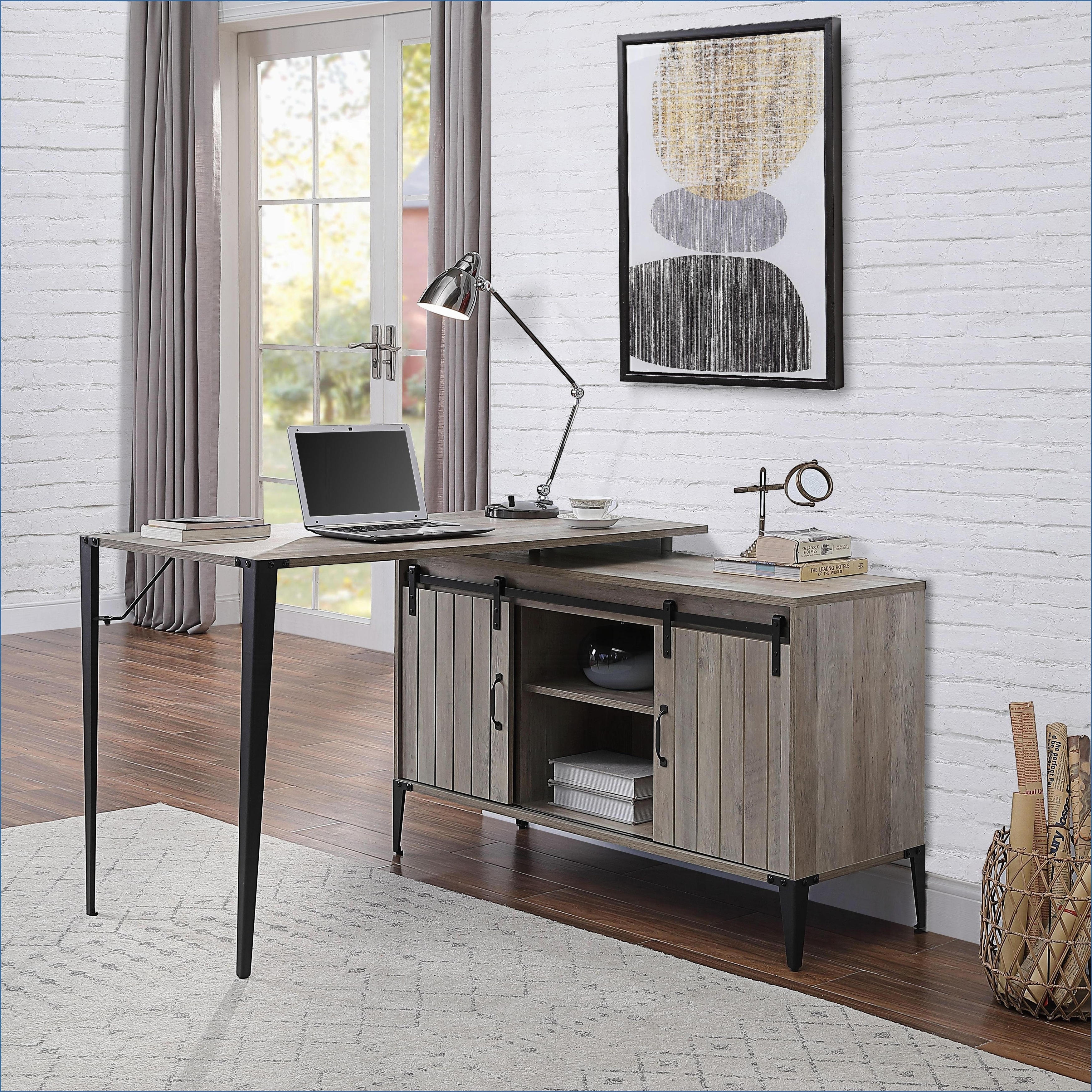 Desks, Grey Oak Modern Writing Desk with Sliding Barn Door and Cord Management, Grey and Black, Paper Composite