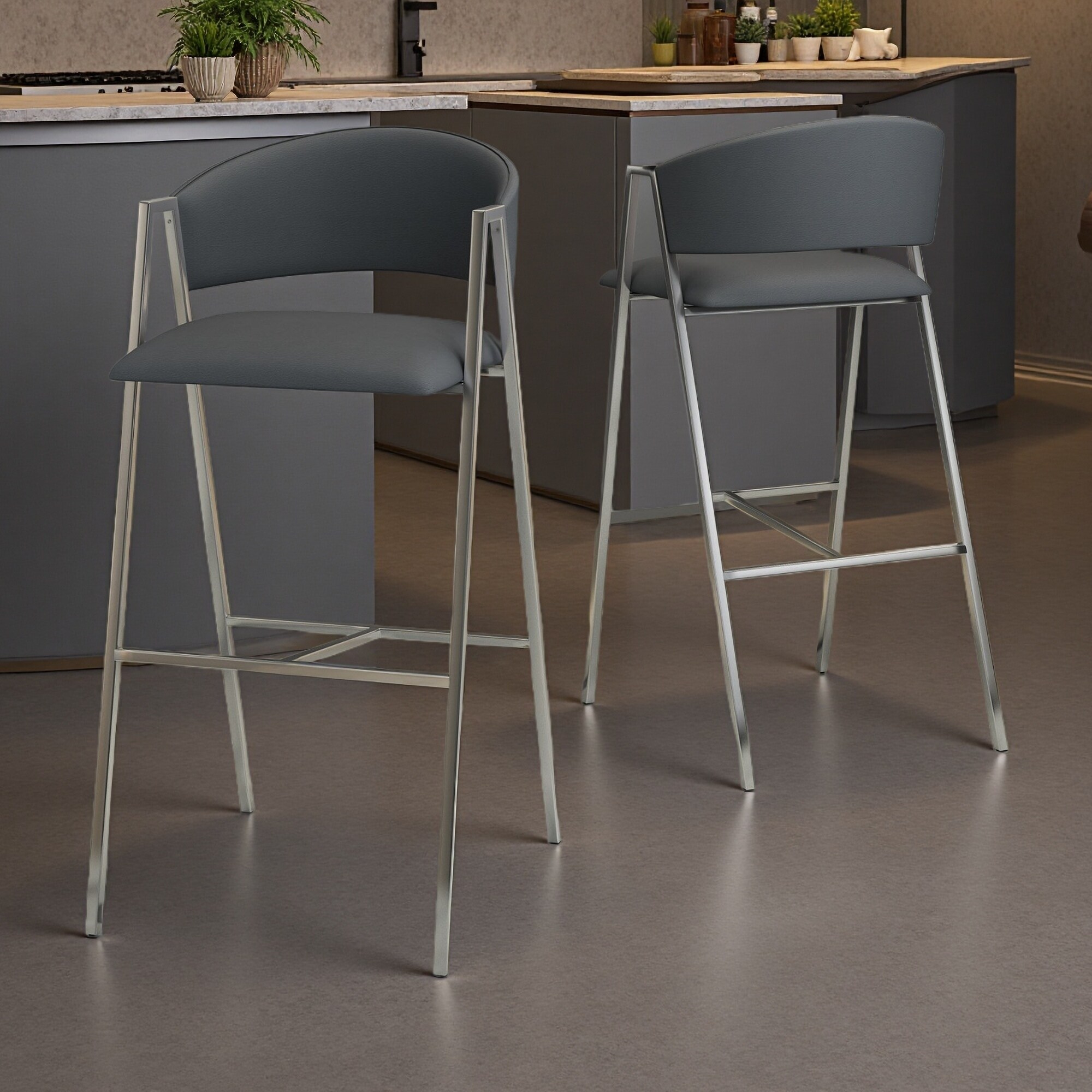 38"H Set of 2 Counter Height Faux PU Leather Barstools with Chrome Metal Frame and Low Back - A-Frame Base, Armrests, Footrest