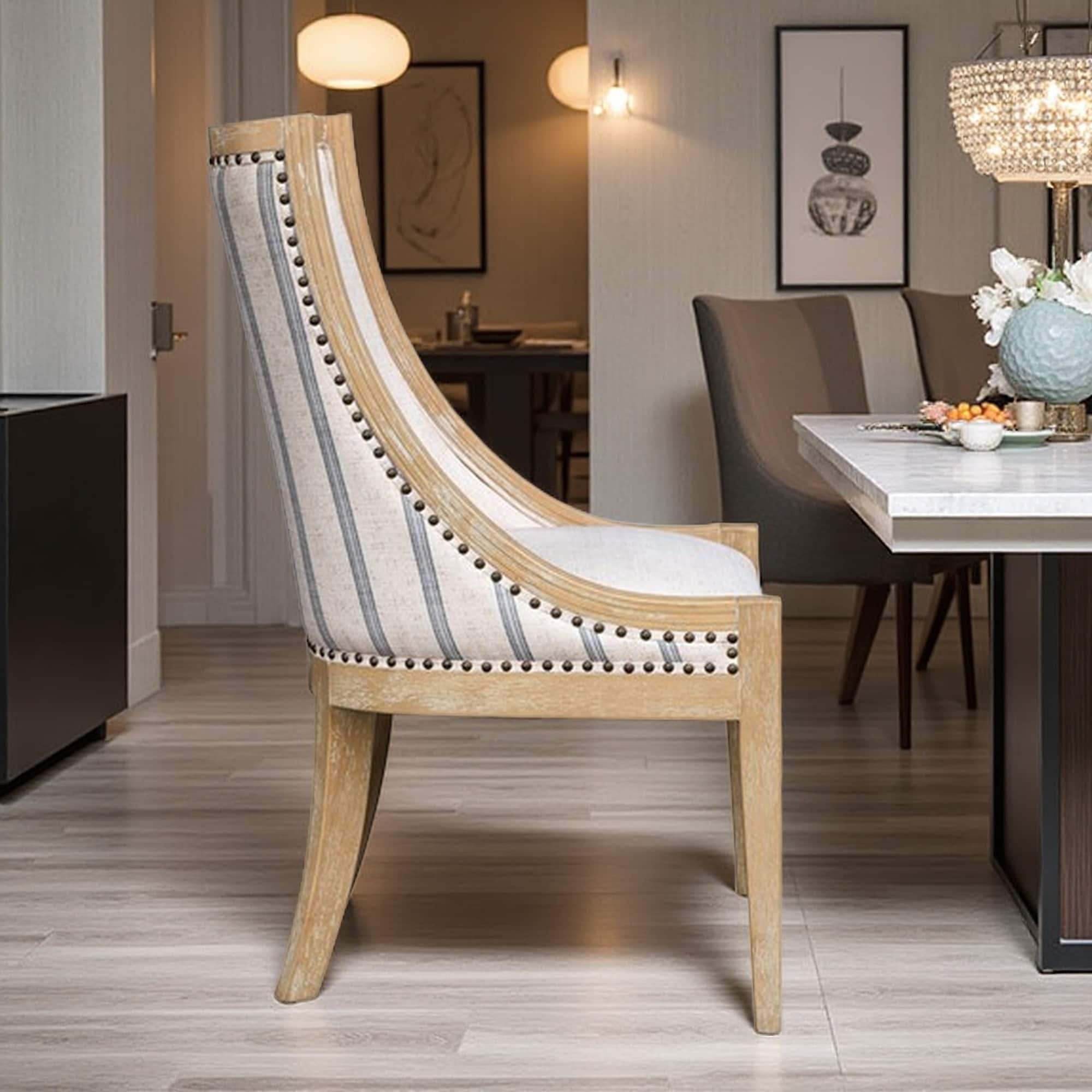 37.5"H Upholstered Dining Chair with Curved Back and Brass Nailhead Trim, Reclaimed Wheat Wood Frame