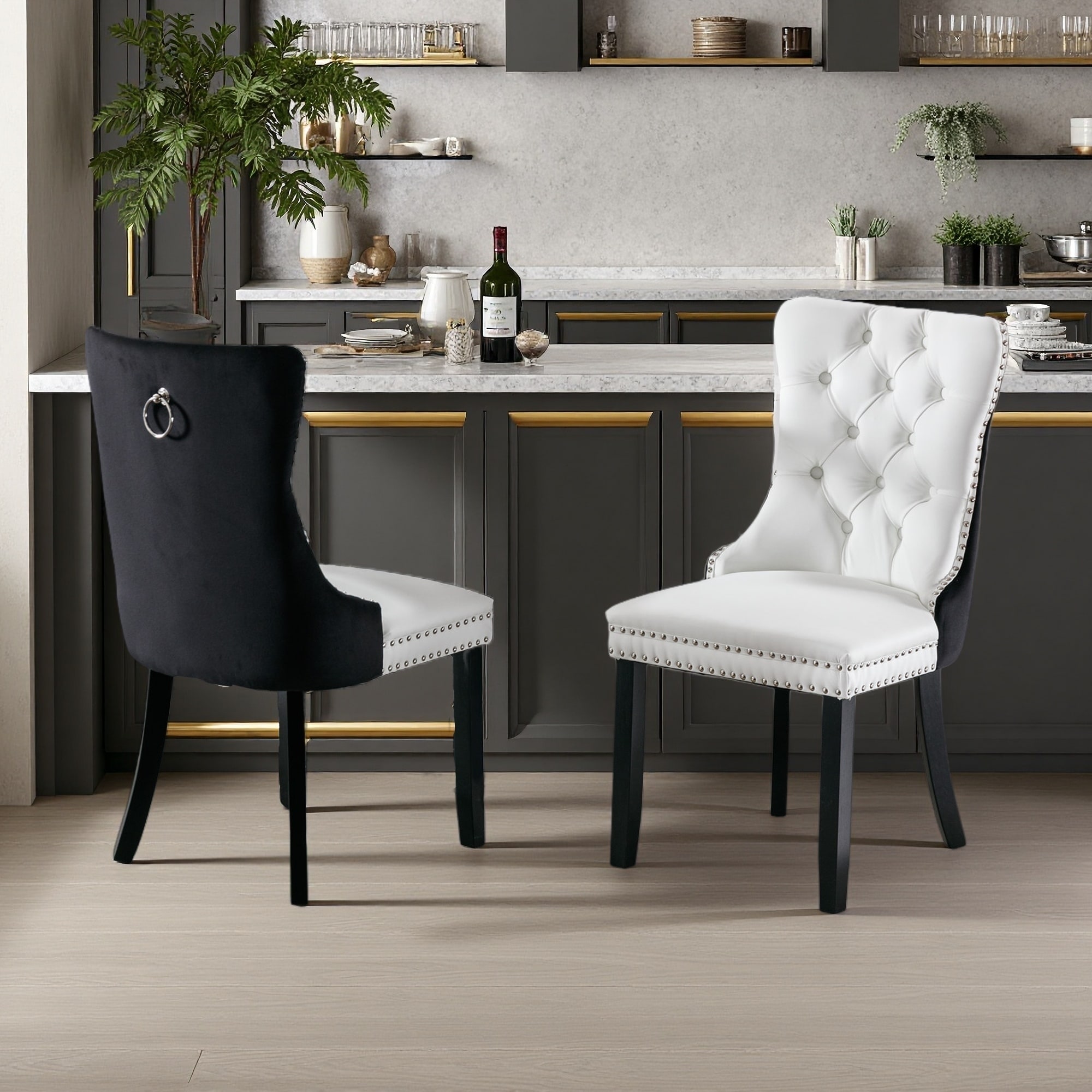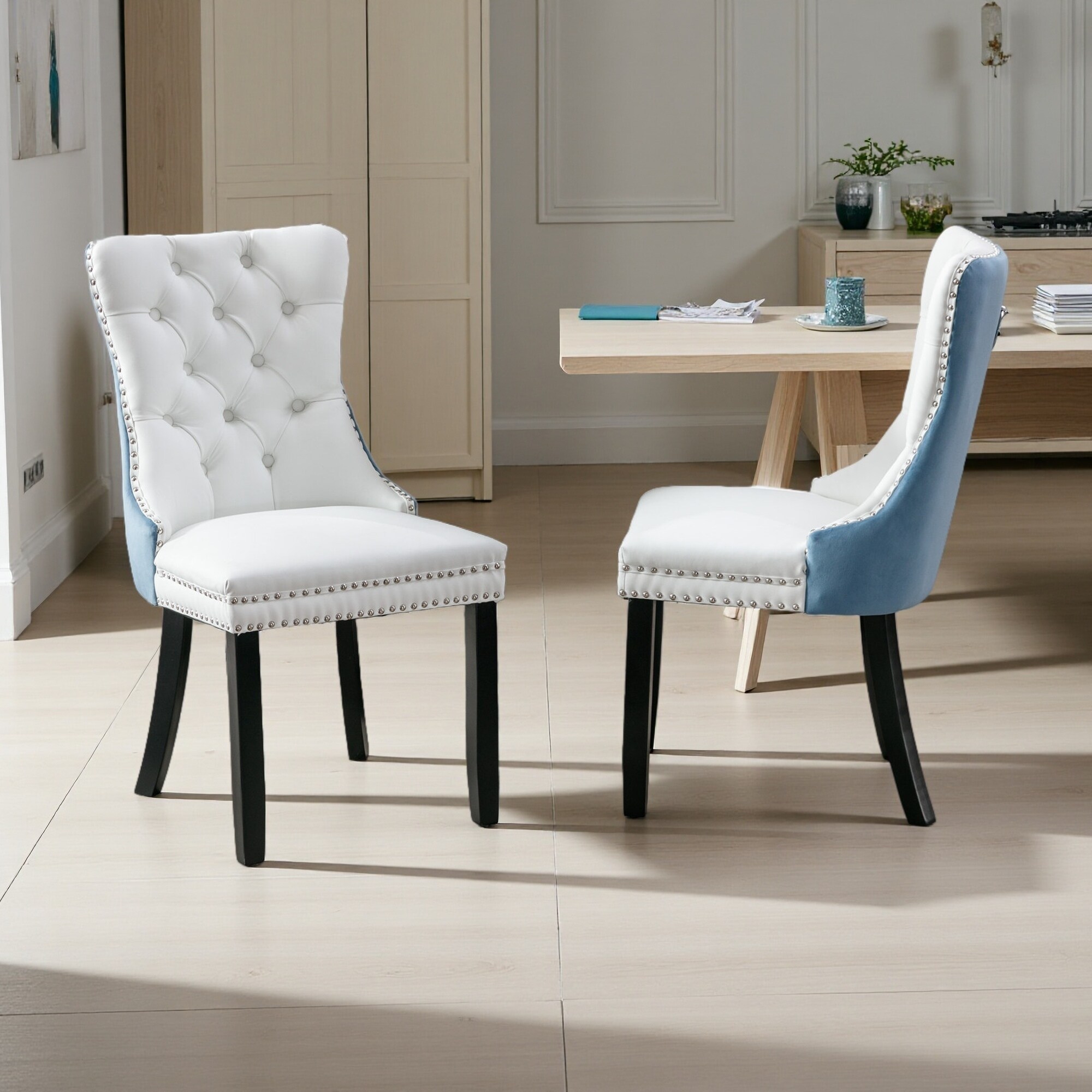37.5"H Set of 2 PU & Velvet Tufted Dining Chairs with Nailhead Trim & Wood Frame