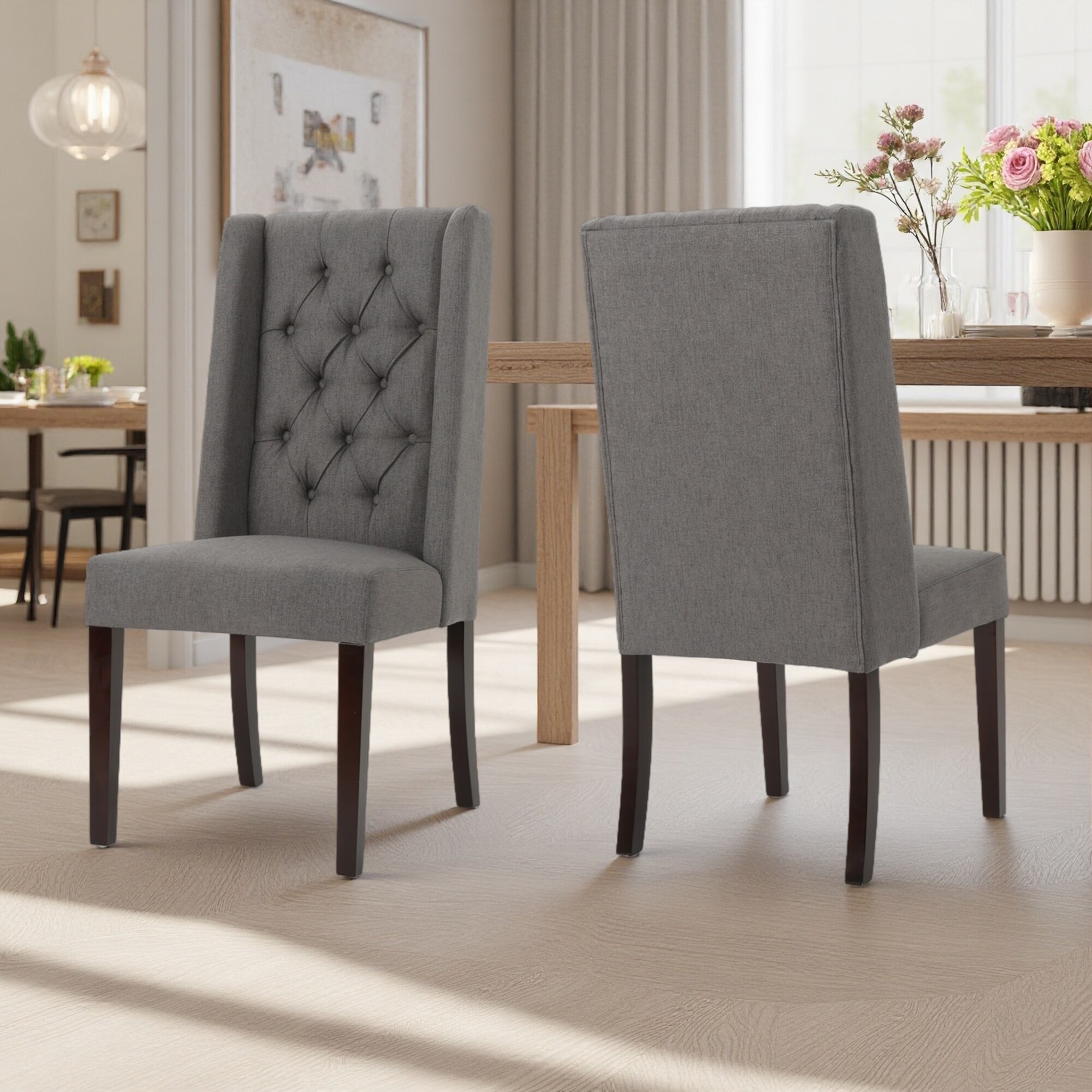 43"H Set of 2 Tufted Polyester Dining Chairs with High Back & Birch Wood Frame