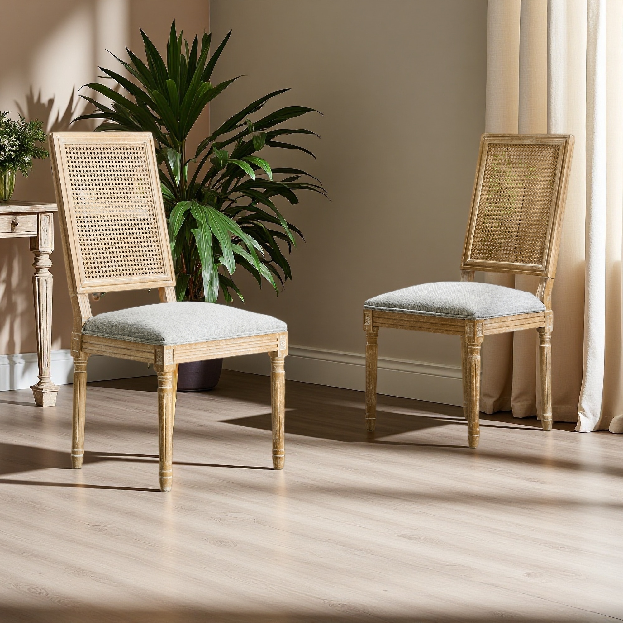 39.5"H Set of 2 French Country Upholstered Cane Back Dining Chairs with Fluted Legs