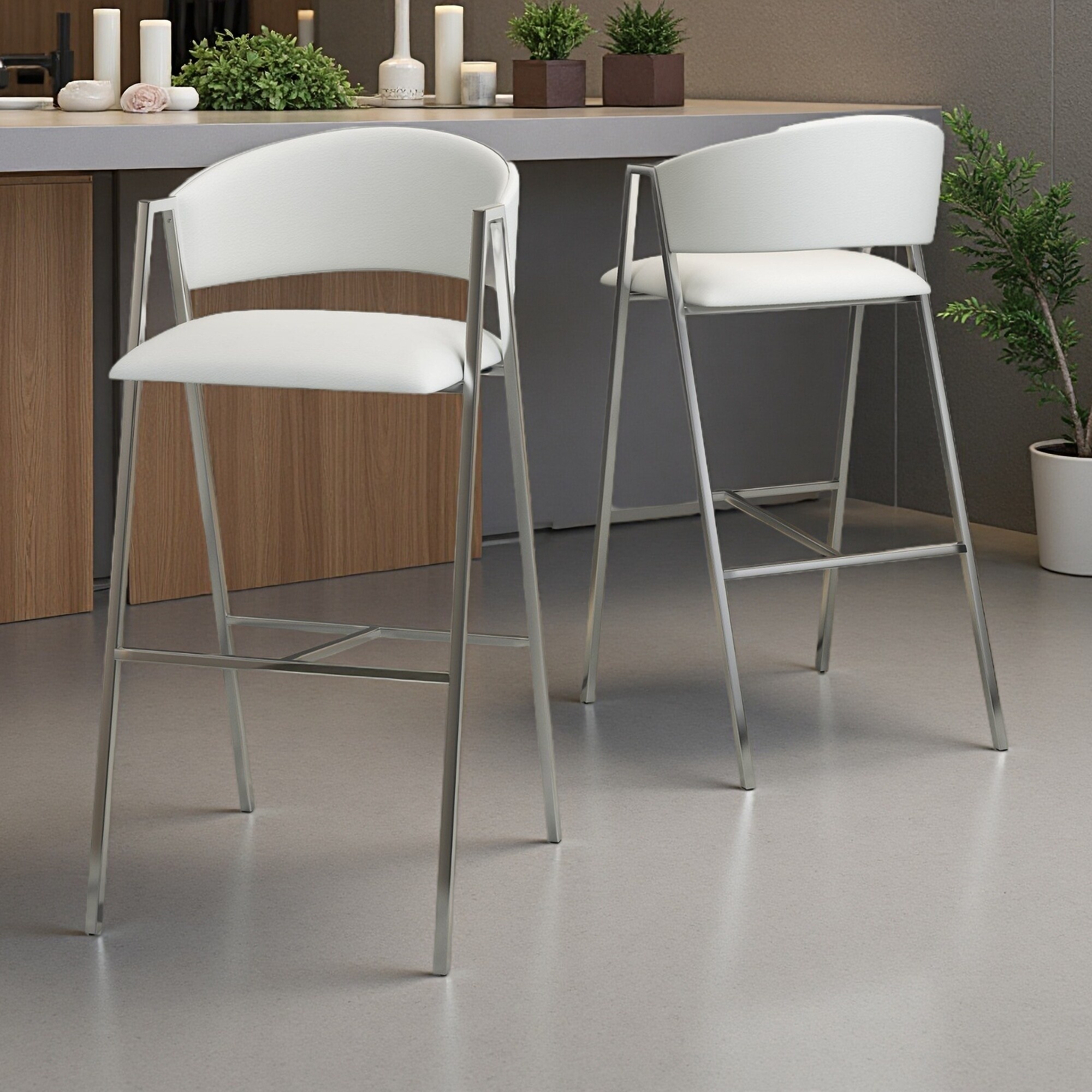 38"H Set of 2 Counter Height Faux PU Leather Barstools with Chrome Metal Frame and Low Back - A-Frame Base, Armrests, Footrest