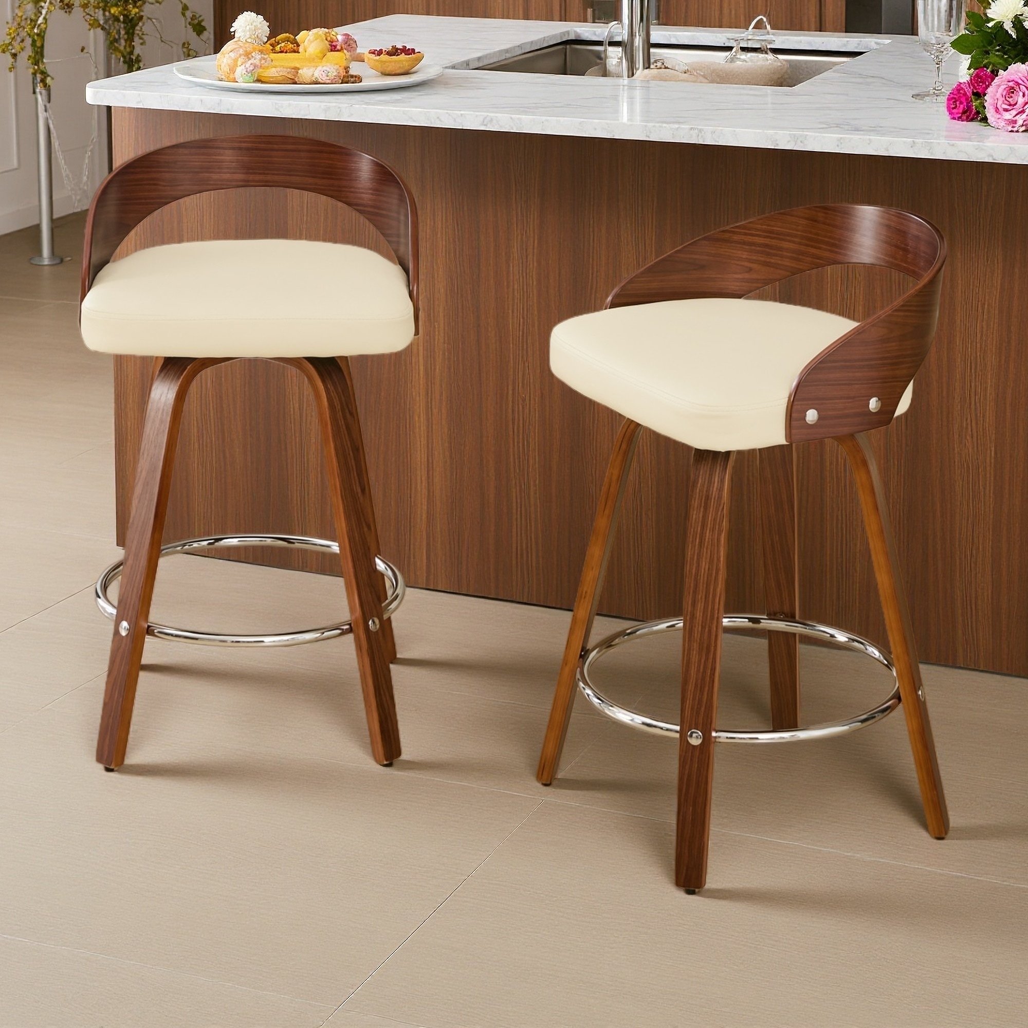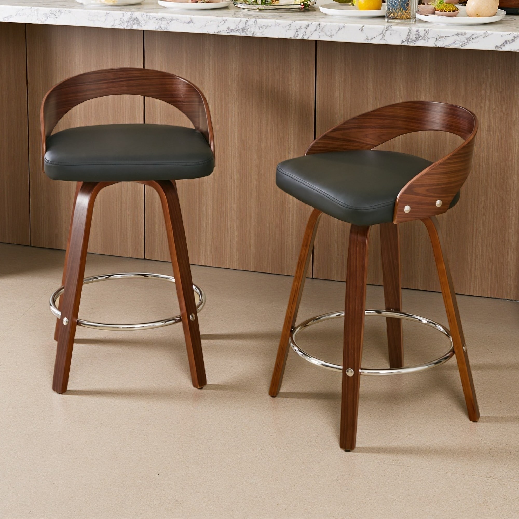 30.5"H Set of 2 Faux Leather Swivel Bar Stools with Walnut Legs & Low Back