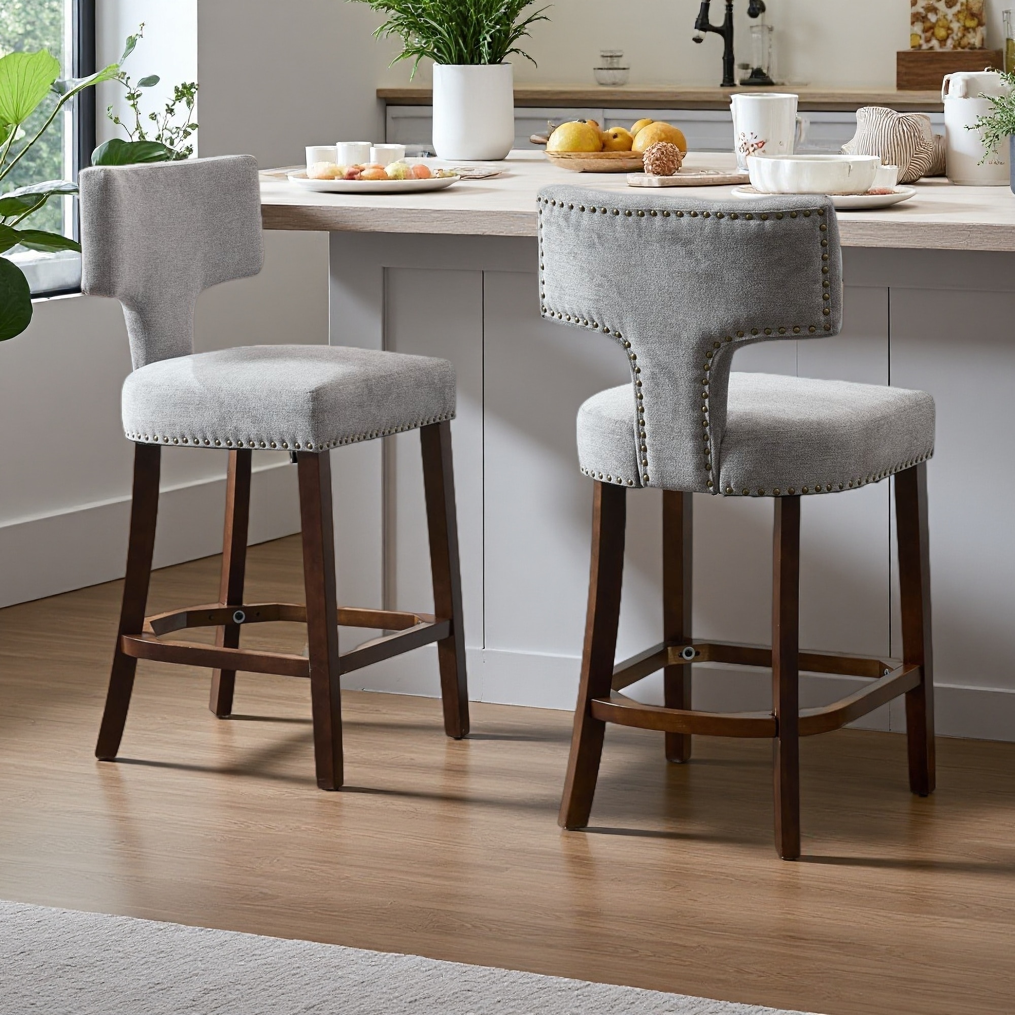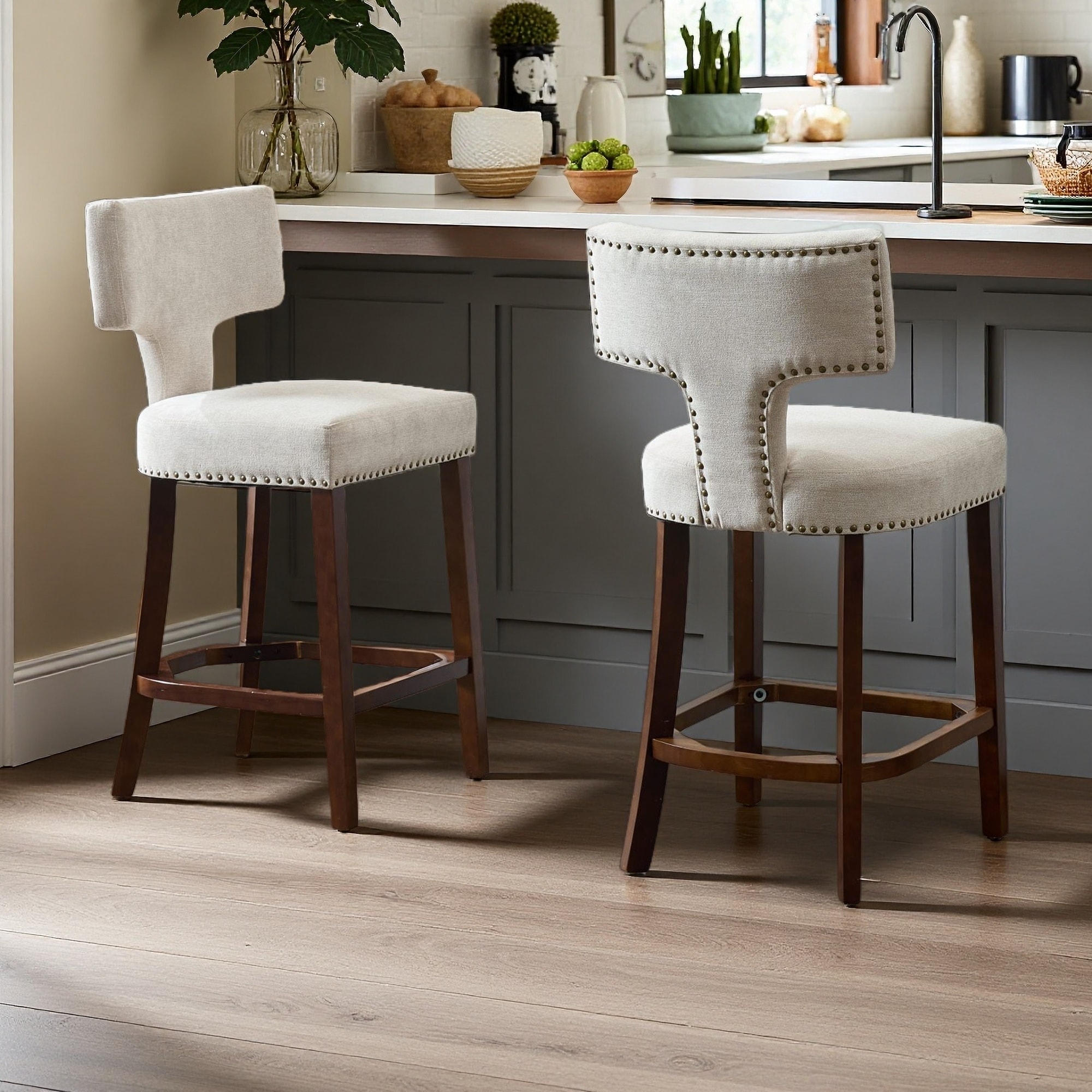 39"H Set of 2 Mid-Century Linen Counter Stools with Curved Back & Nailhead Trim