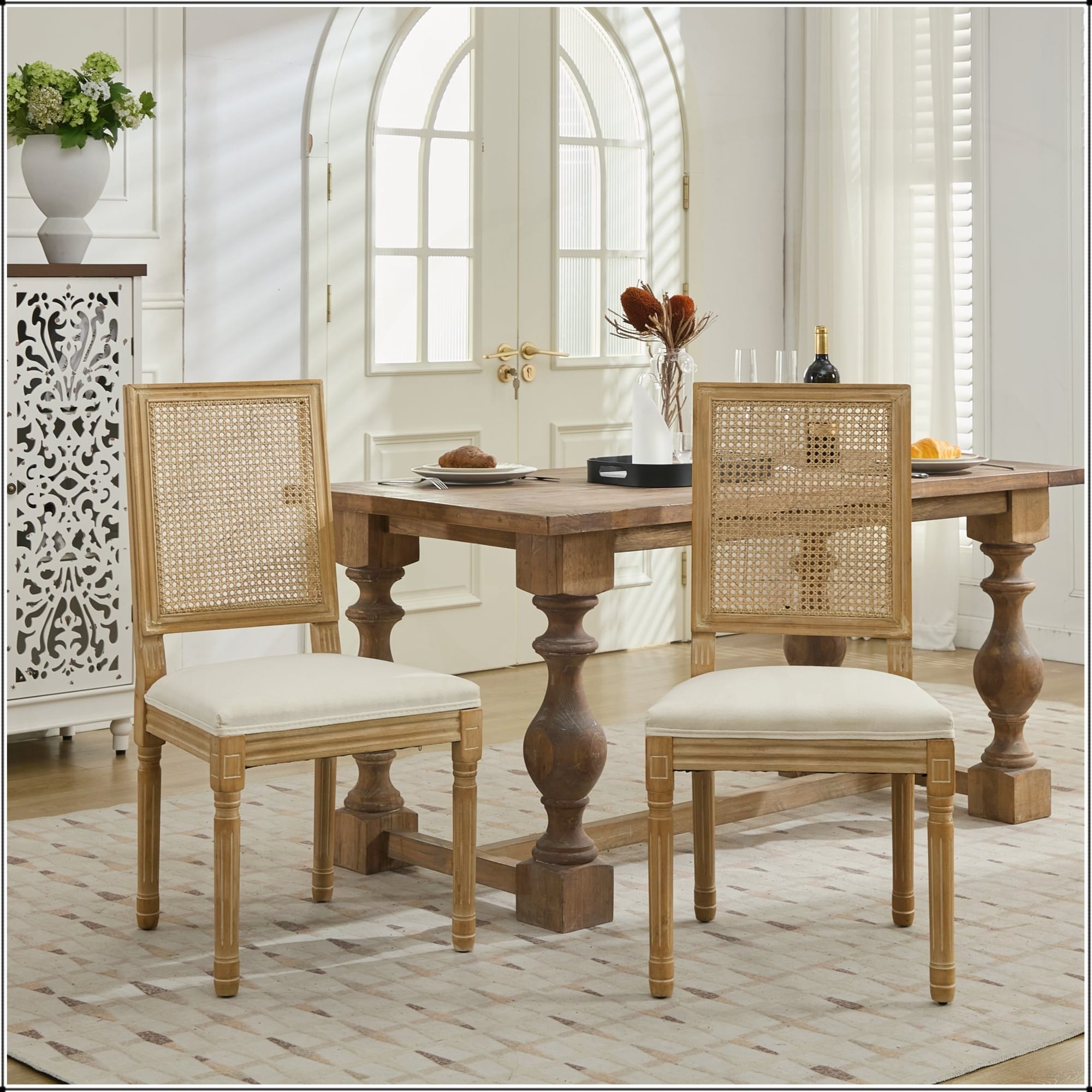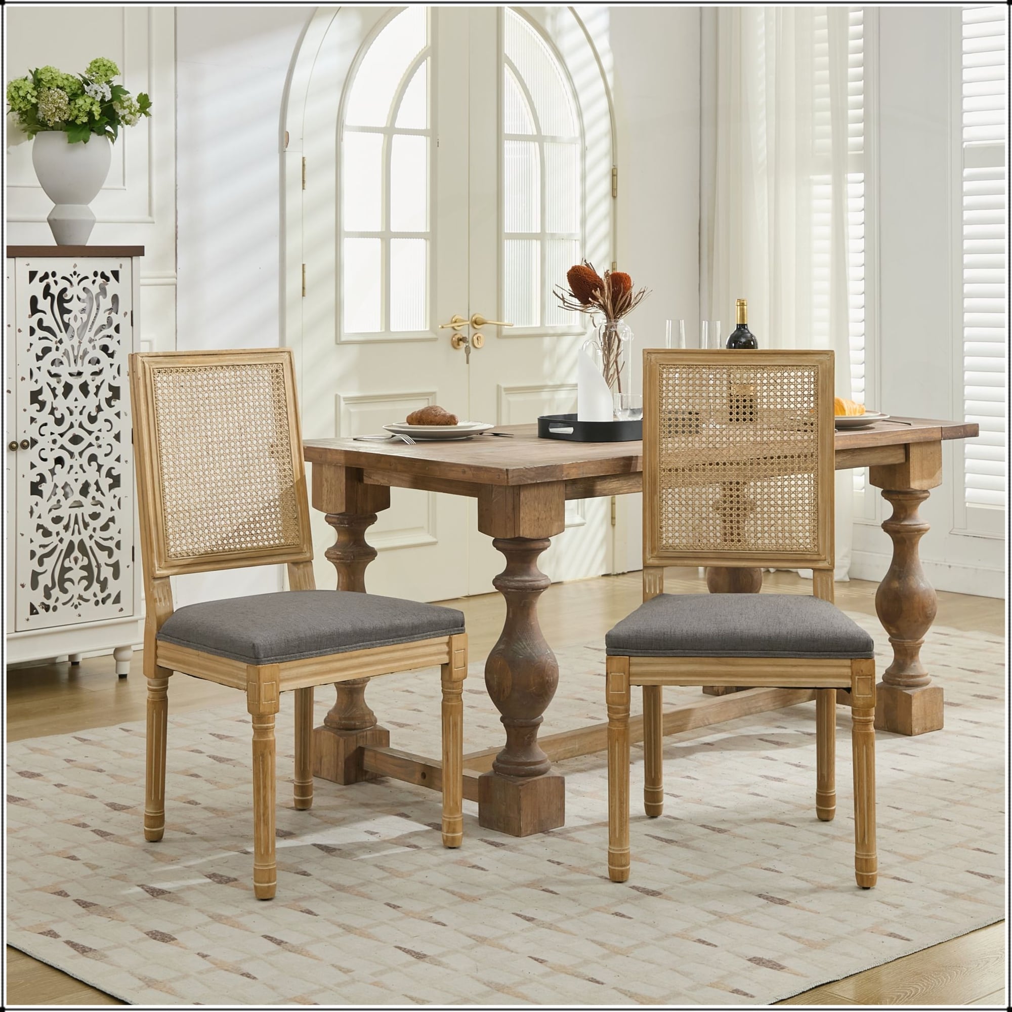 French Decor Chairs with Square Rattan Backrest Set of 2