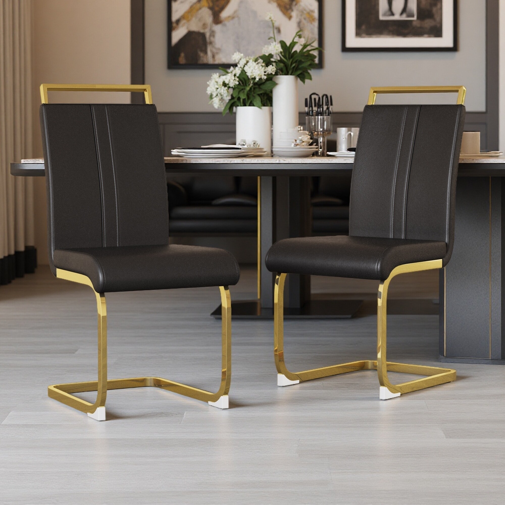 38.58"H Set of 2 Modern High-Back PU Faux Leather Upholstered Dining Chairs with C-Shaped Metal Legs, Thick Cushions for Office