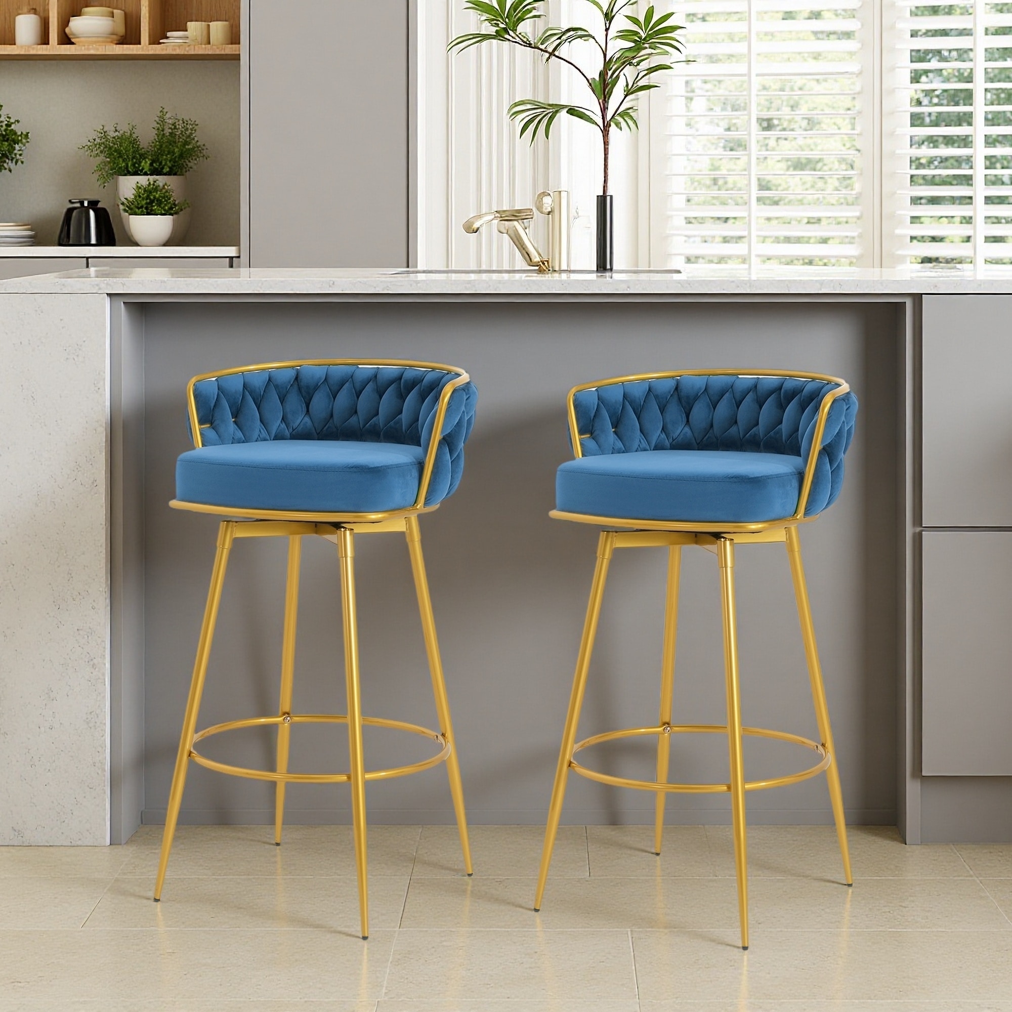 37.4"H Set of 2 Velvet Swivel Counter Height Bar Stools 180° Swivel with Hand-Woven Low Back & Metal Legs Footrest, Upholstered