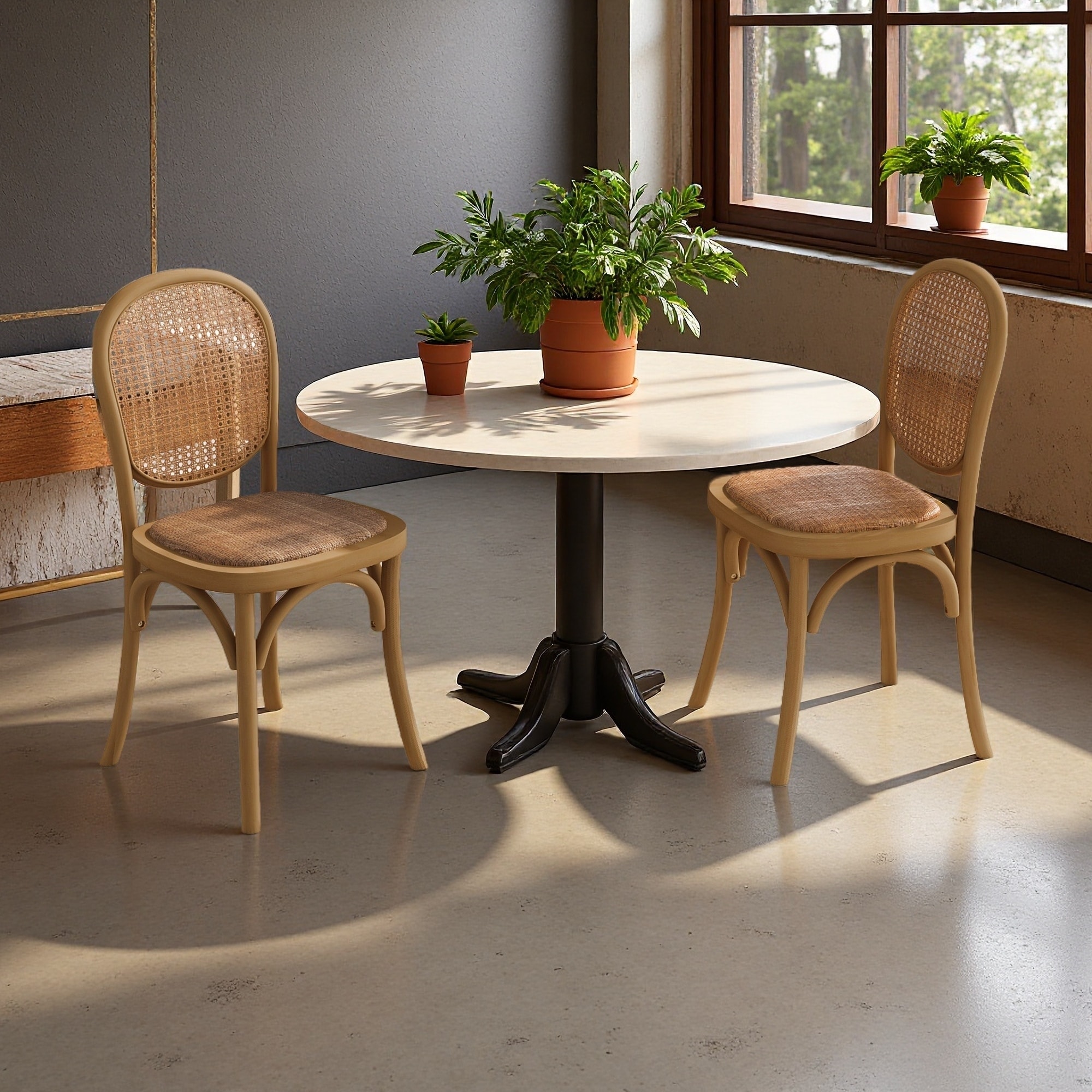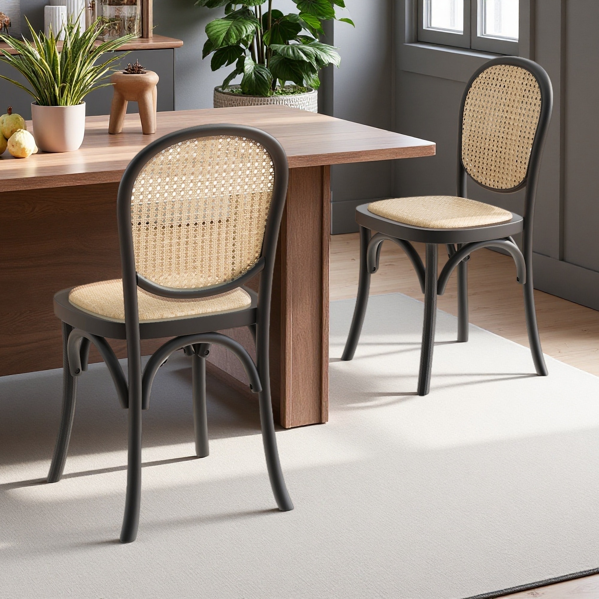35"H Set of 2 Vintage Rattan Dining Chairs with Birch Wood Frame