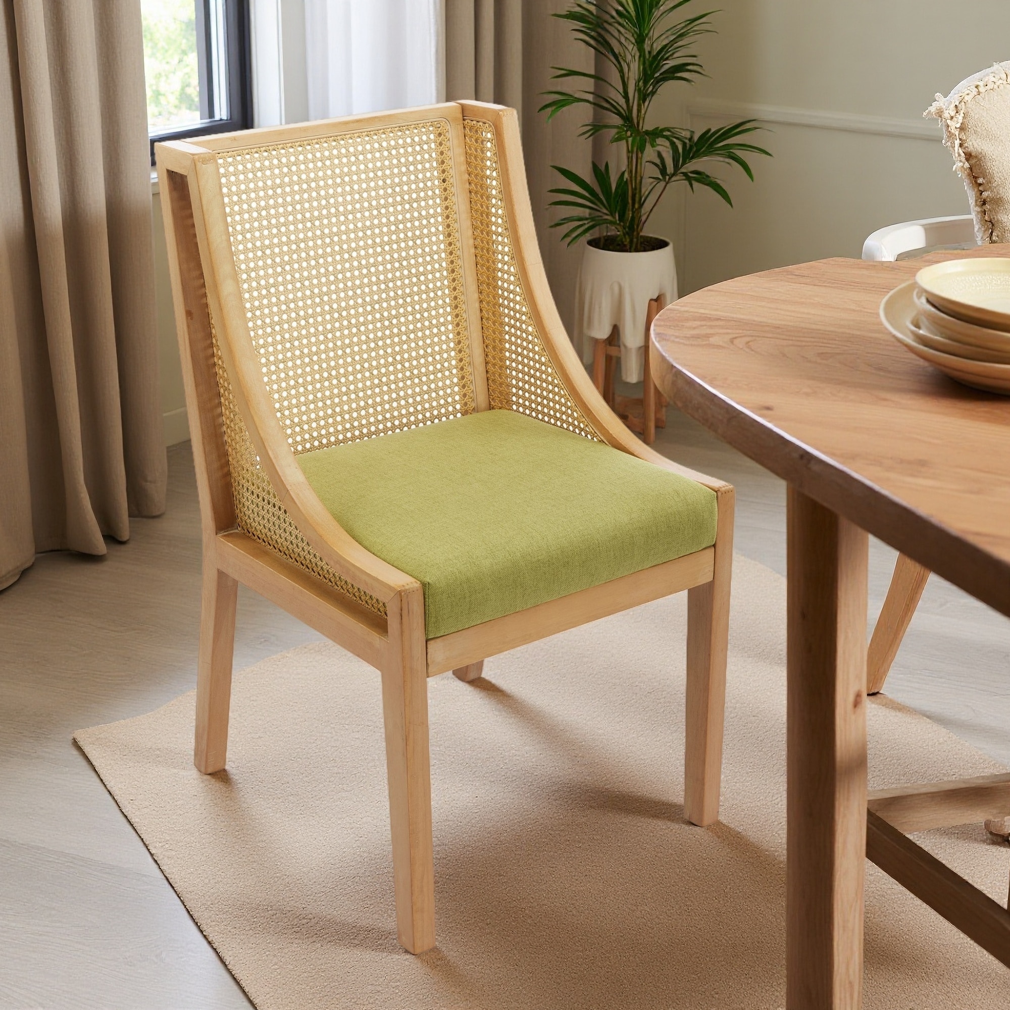 37.4"H Set of 2 Solid Wood & Rattan Dining Chairs with Decorative Armrests, Linen Upholstered Seat, Rustic Natural Finish