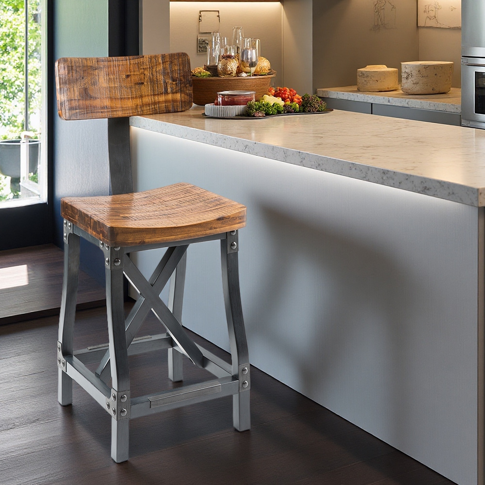 42.5"H Solid Acacia Wood Bar Stool with Amber Finish, Graphite Metal Base & Removable Back