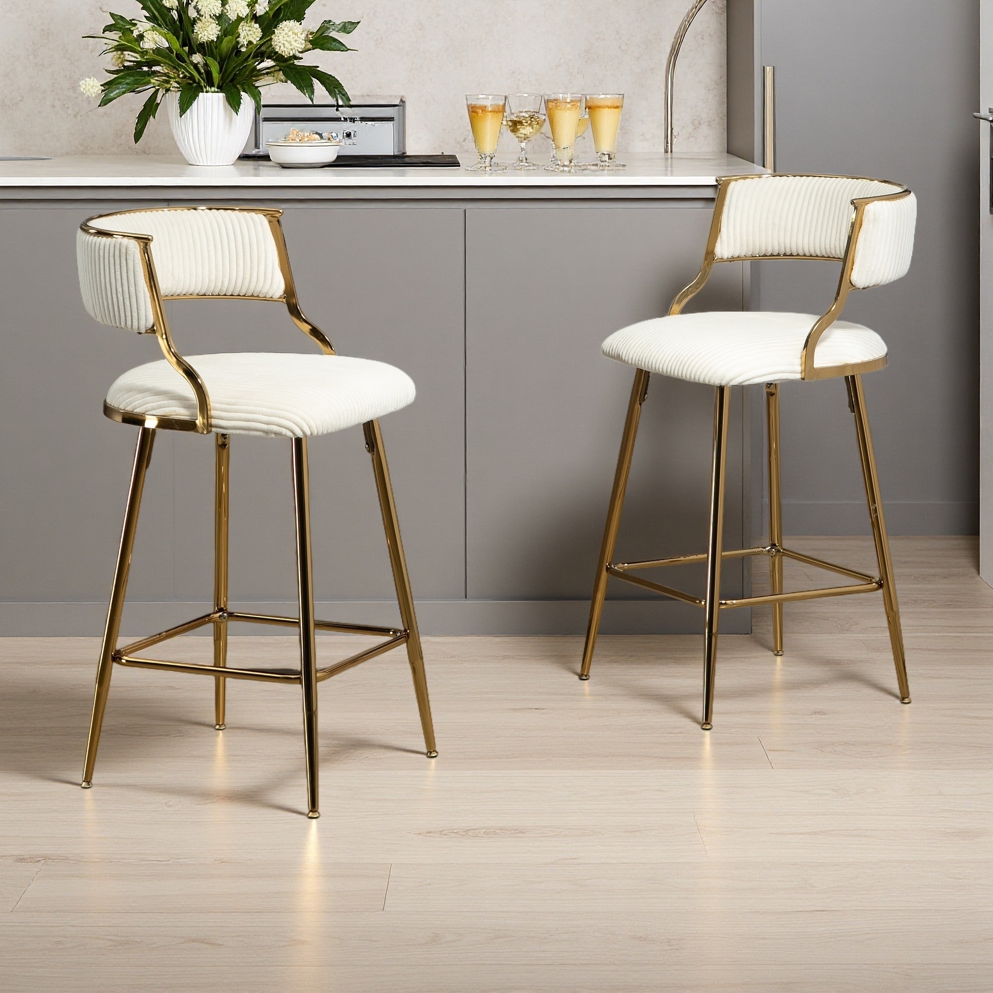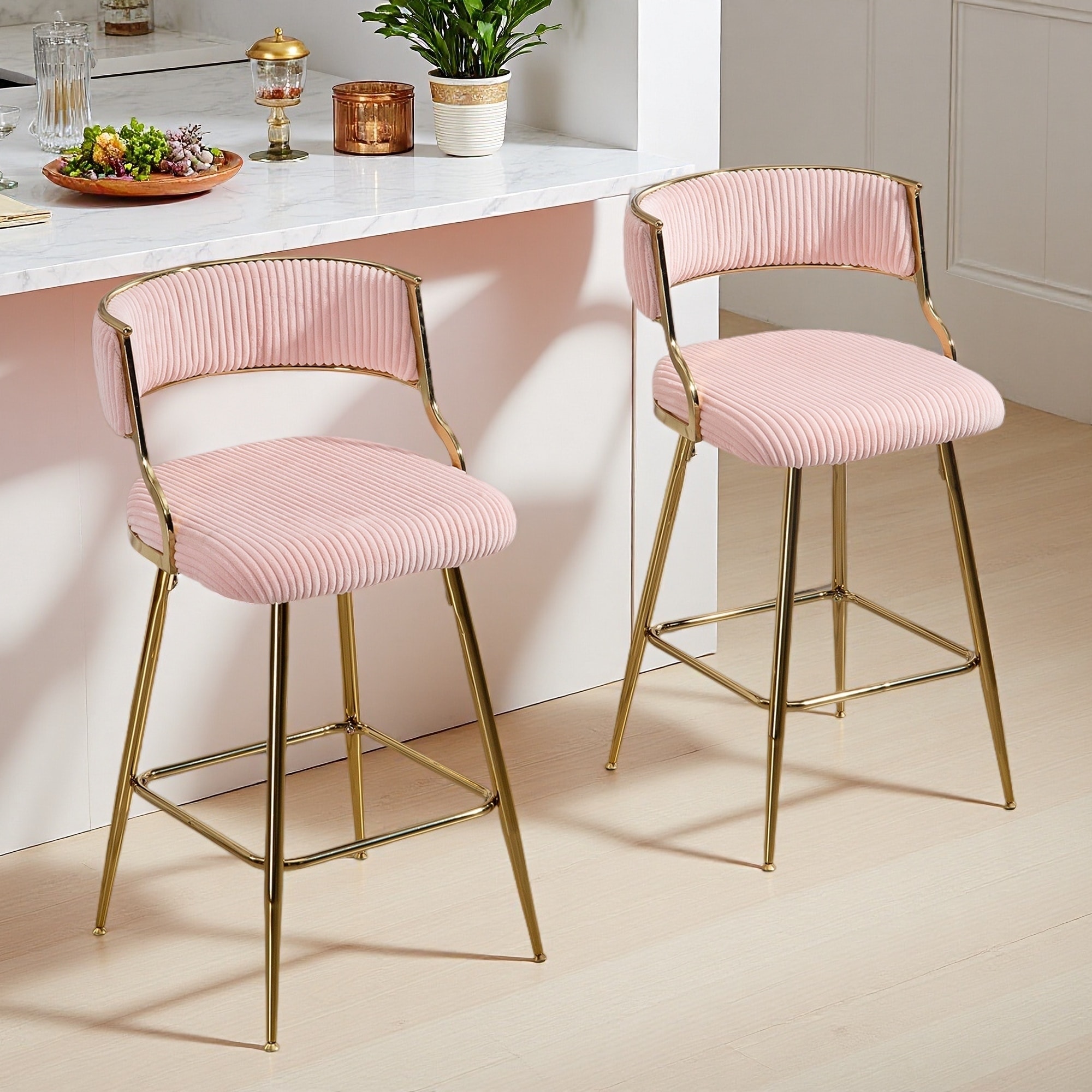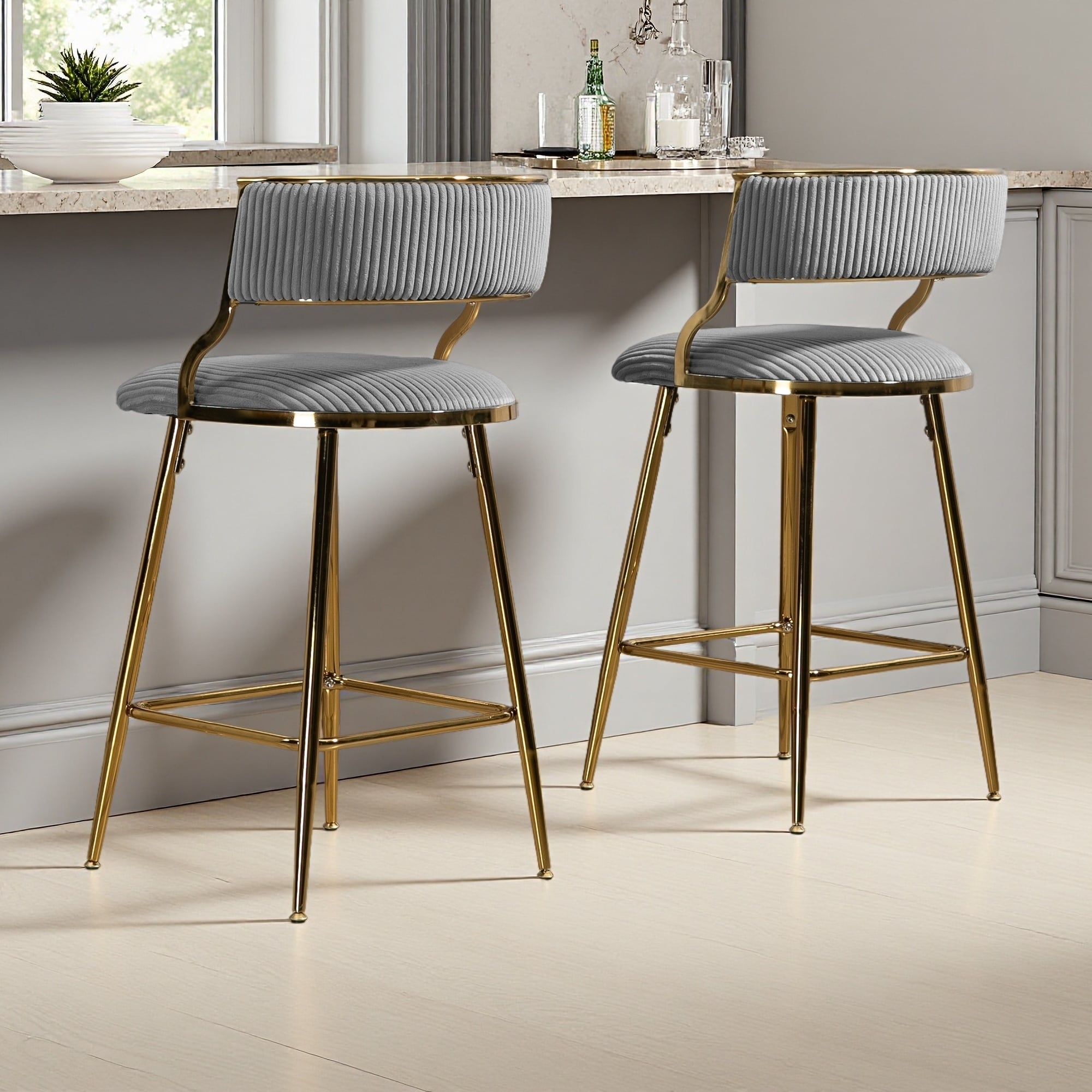 35"H Set of 2 Corduroy Counter Height Bar Stools with Backrest Upholstered Kitchen Island Chairs with Chrome Base & Footrest