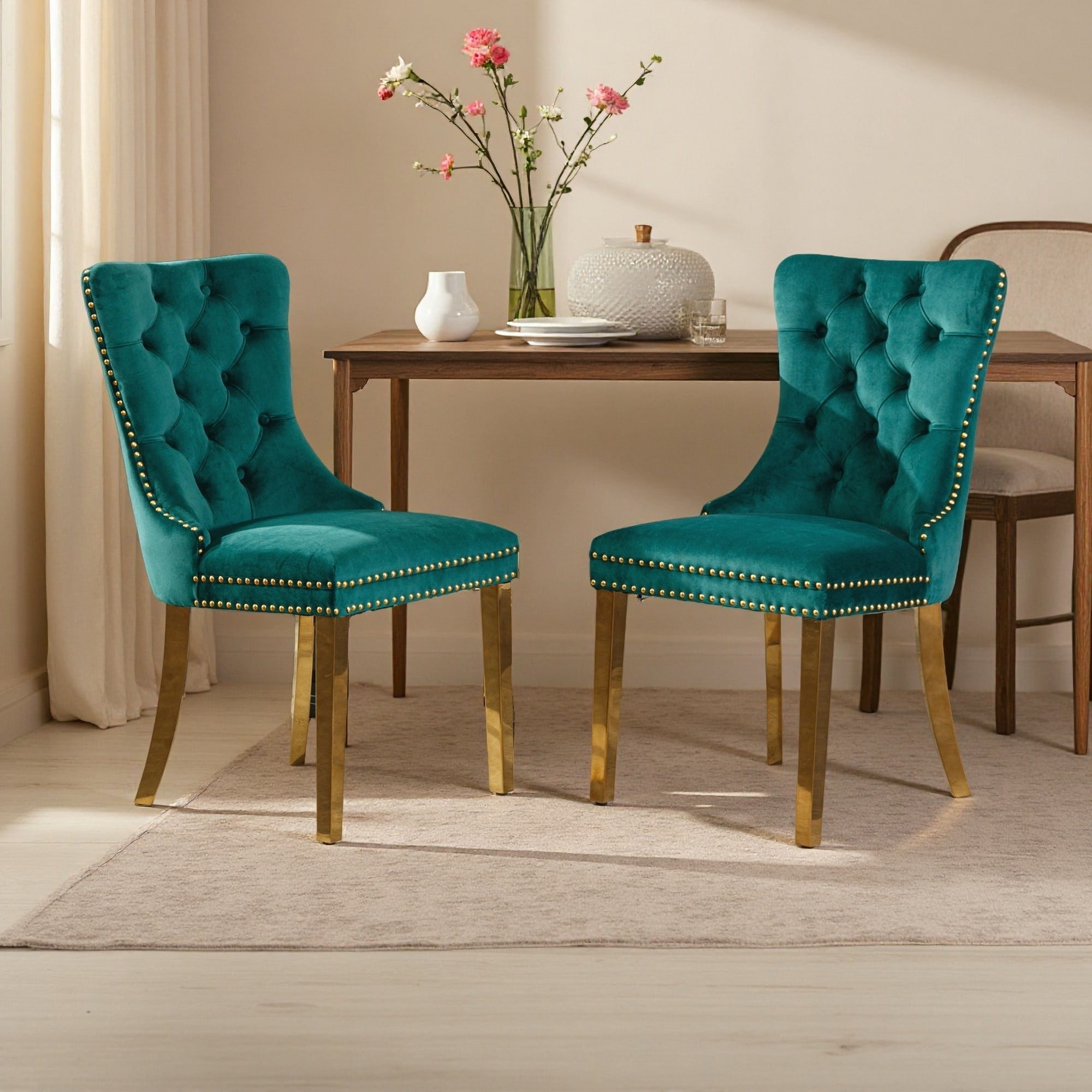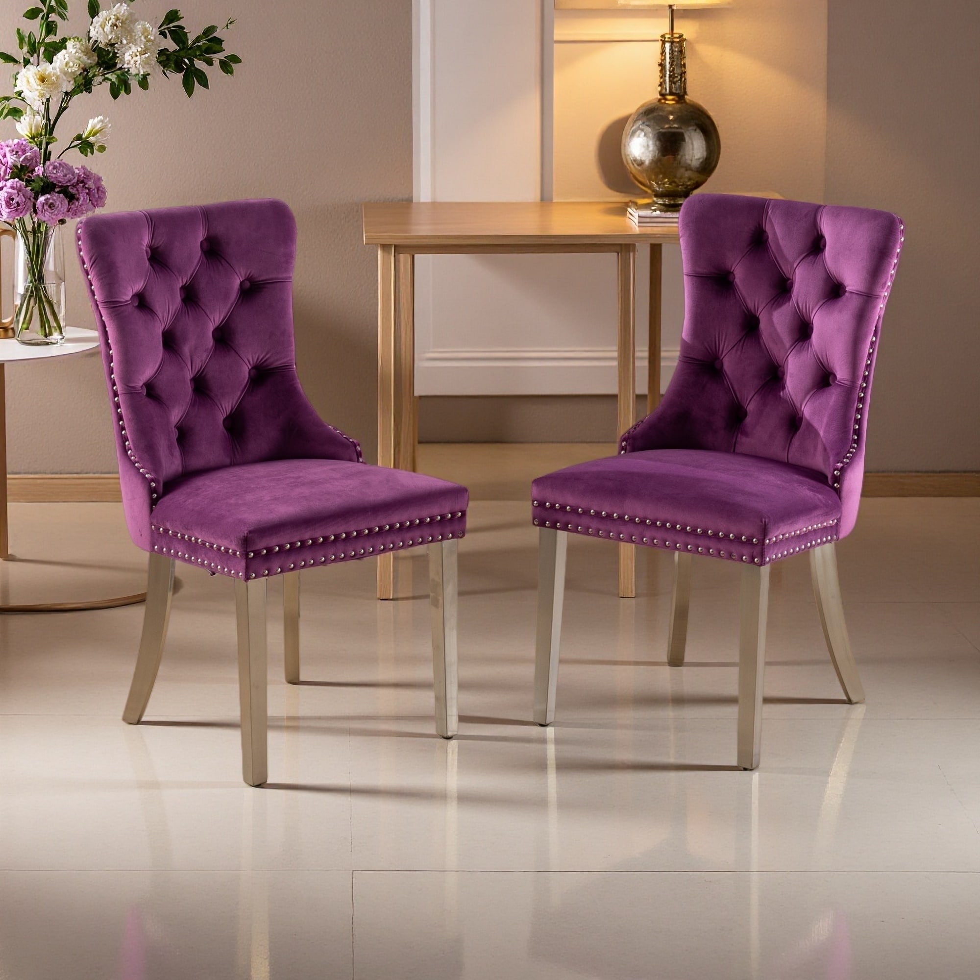 37.5"H Set of 2 Velvet Tufted Solid Wood Dining Chairs with Chrome Stainless Steel Legs & Nailhead Trim - High Rebound Cushion