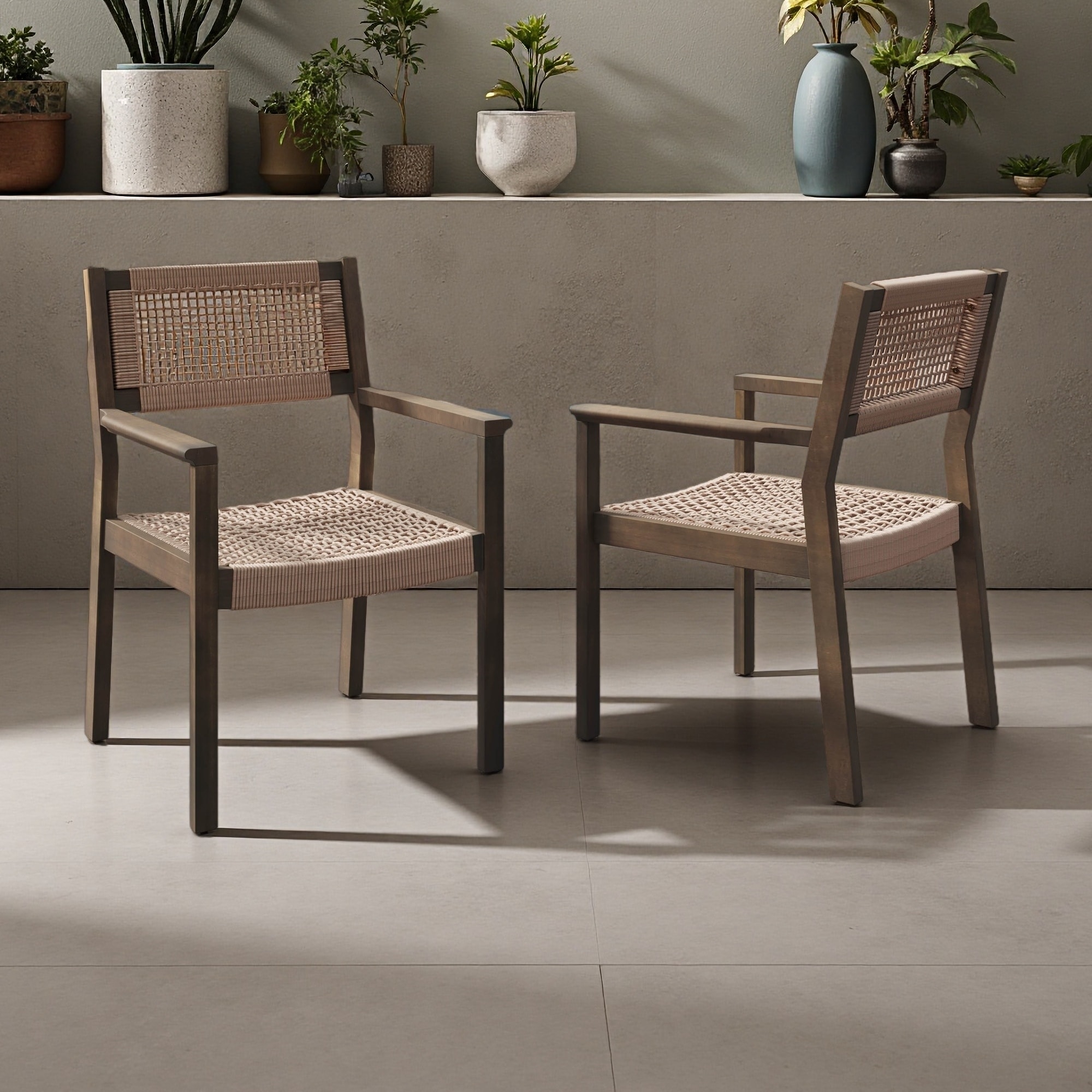 35"H Set of 2 Acacia Wood & Rope Patio Dining Chairs with Cushions