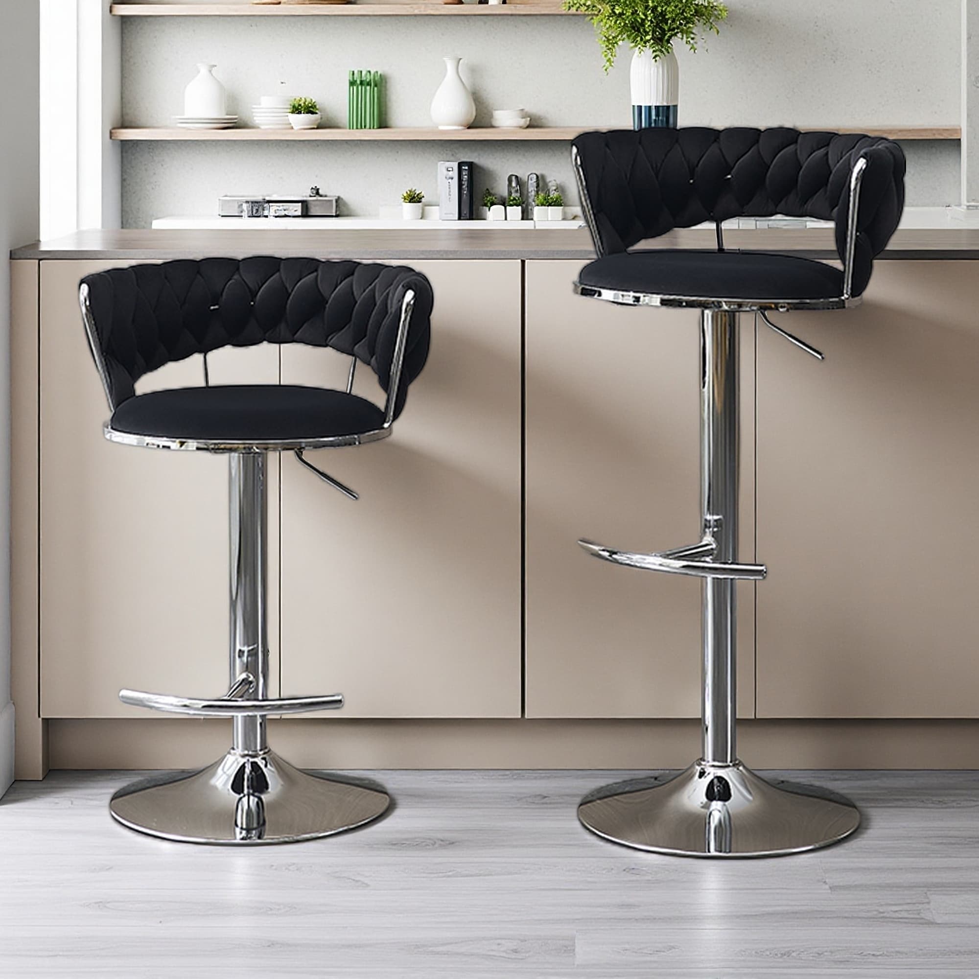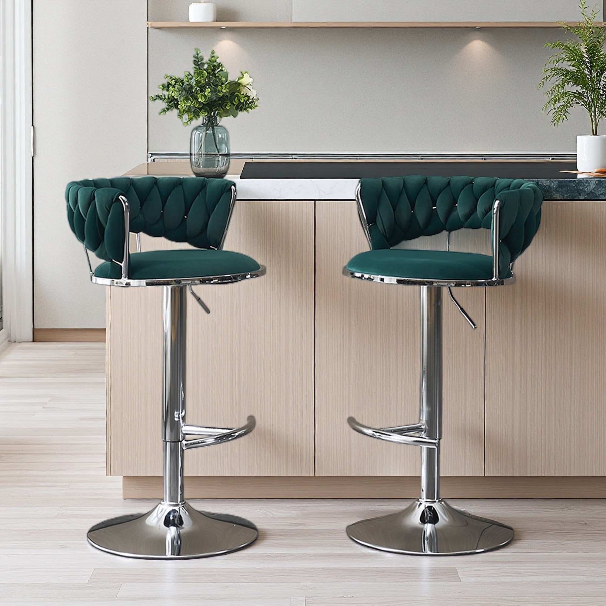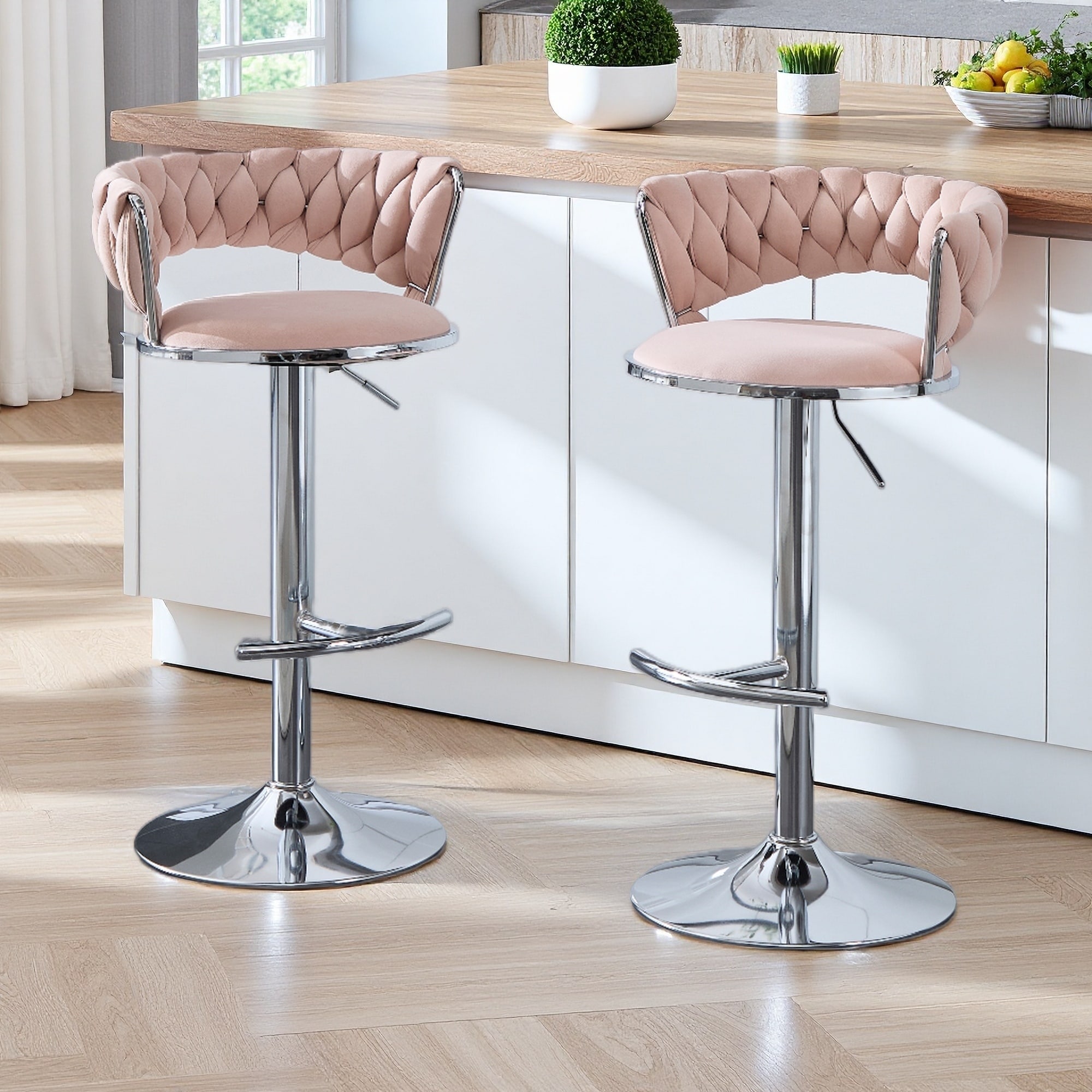 30.7"H Set of 2 Velvet Bar Stools with Chrome Swivel Base & Adjustable Height with Openwork Design & Footrest for Kitchen Island