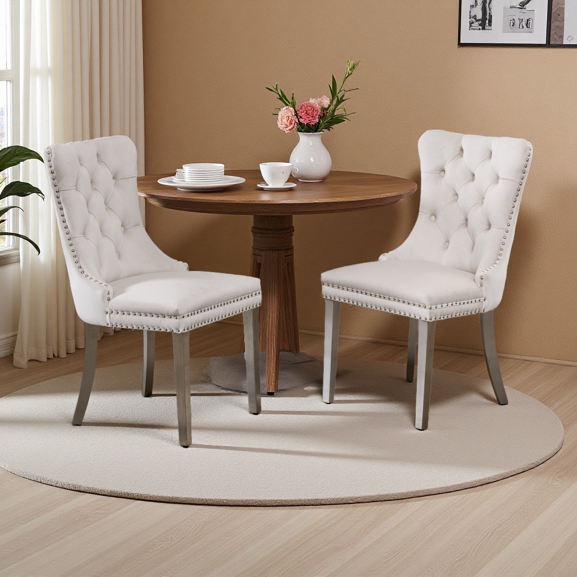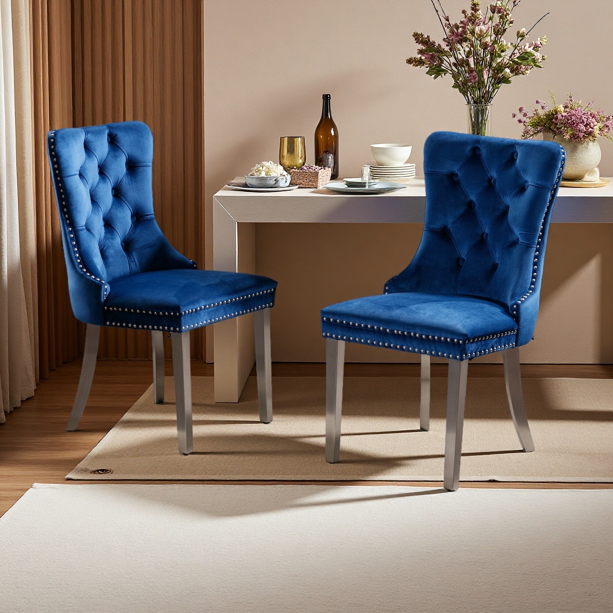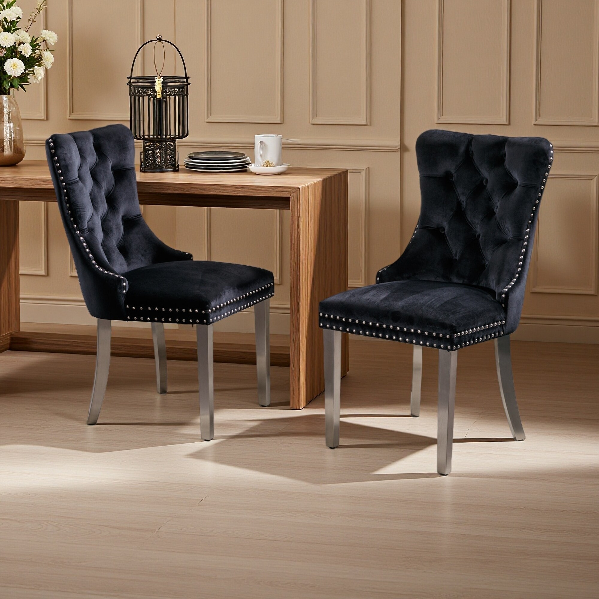 37.5"H Set of 2 Velvet Tufted Solid Wood Dining Chairs with Chrome Stainless Steel Legs & Nailhead Trim - High Rebound Cushion