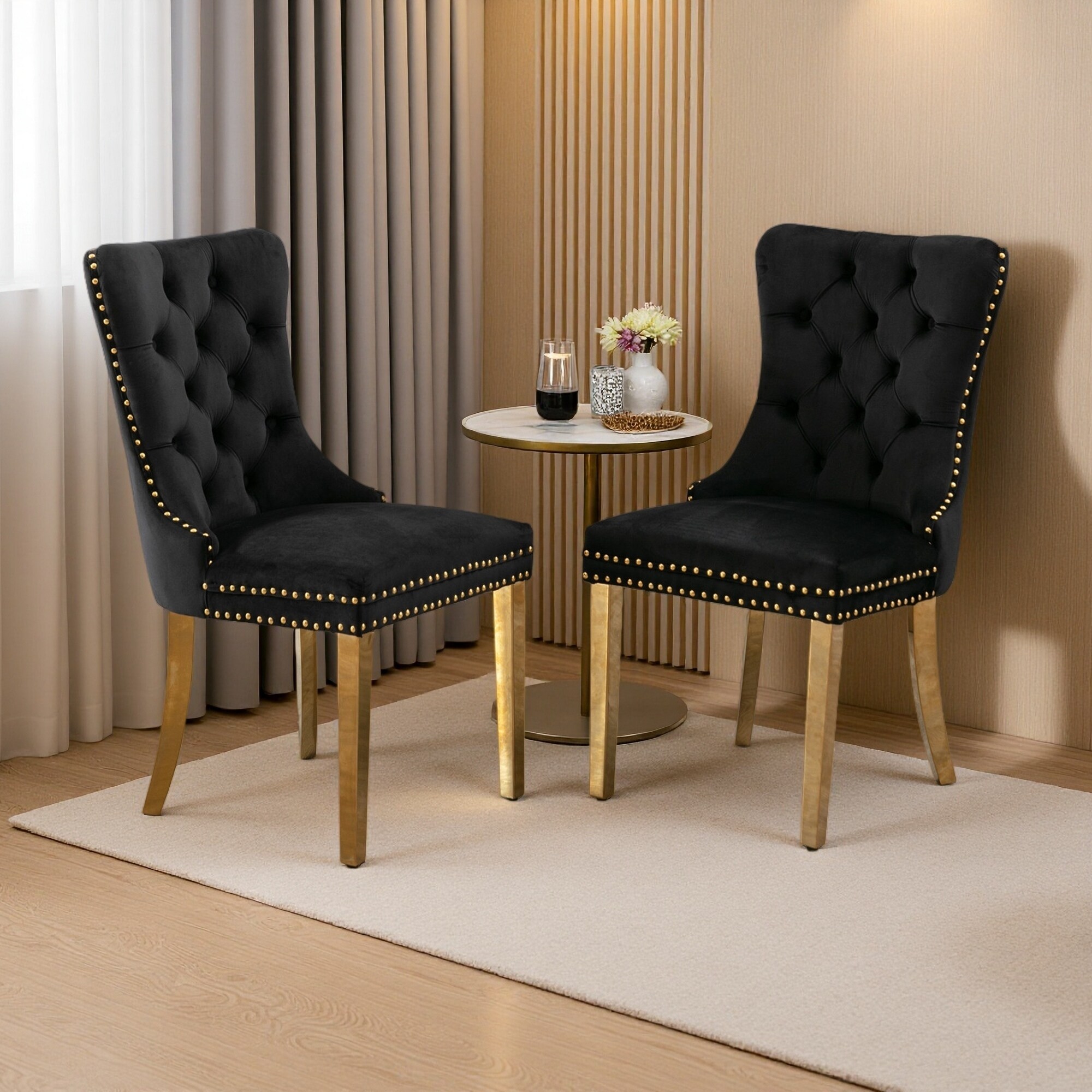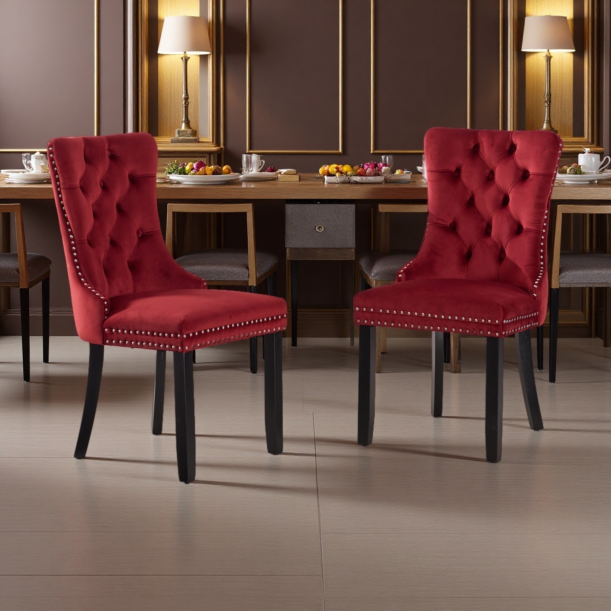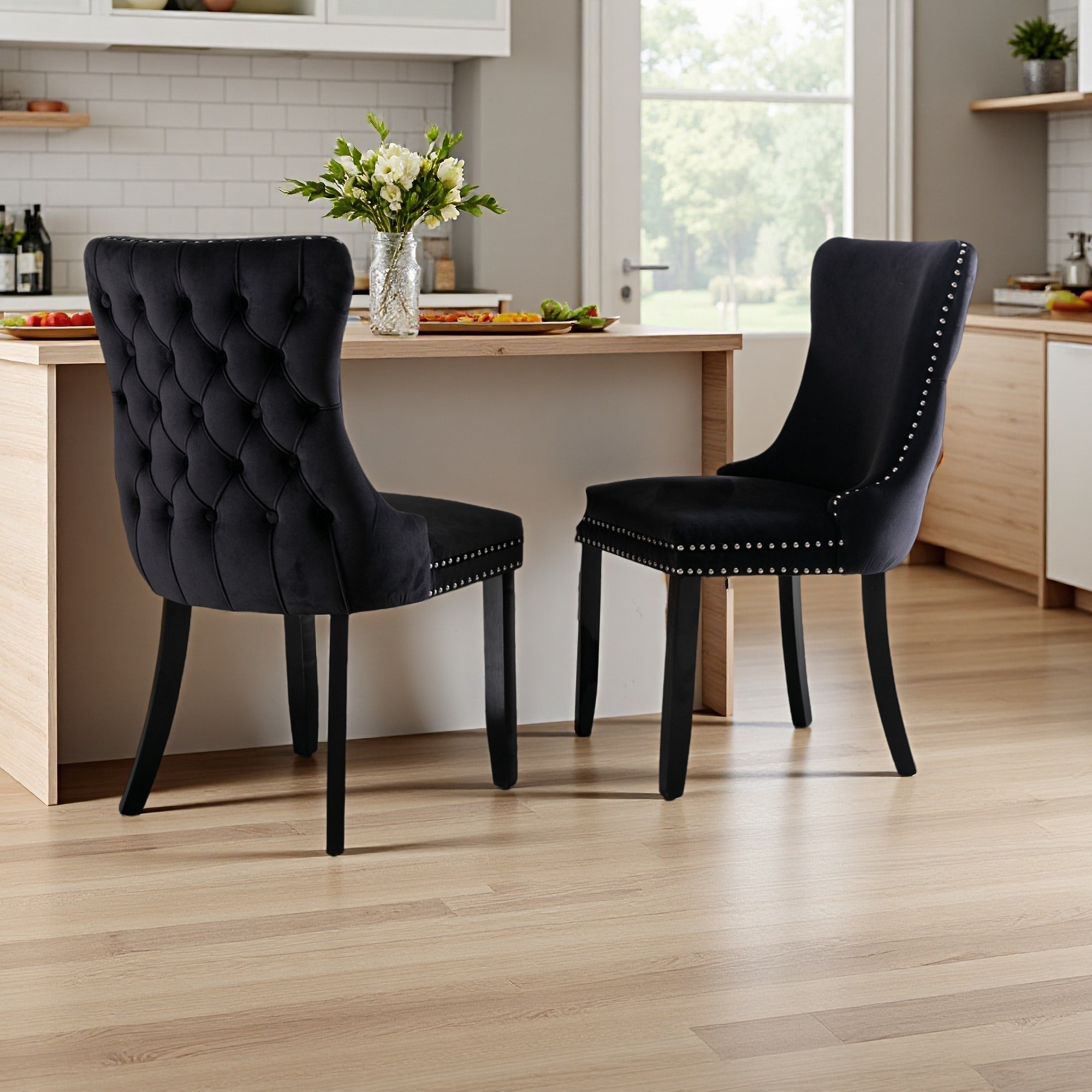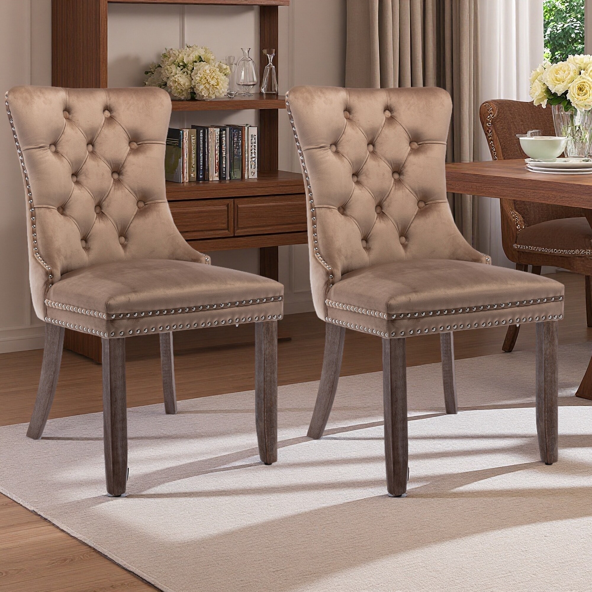 37.4"H Set of 2 Tufted Velvet High-Back Dining Chairs with Nailhead Trim & Solid Wood Legs