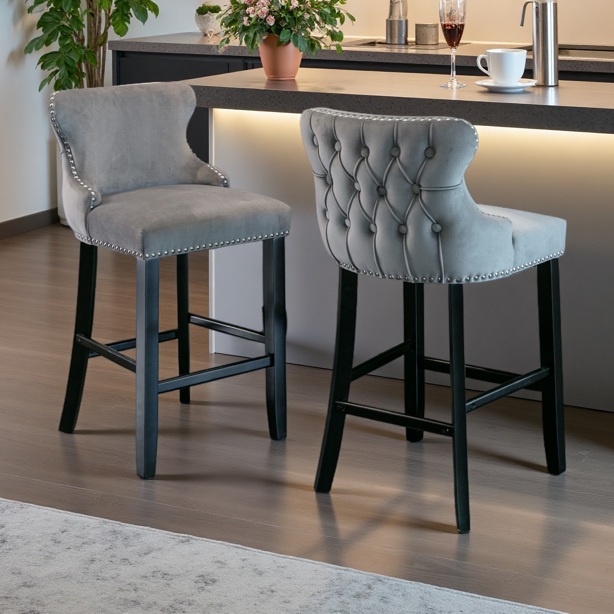 37"H Set of 2 Velvet Wing-Back Bar Stools with Tufted Back & Nailhead Trim