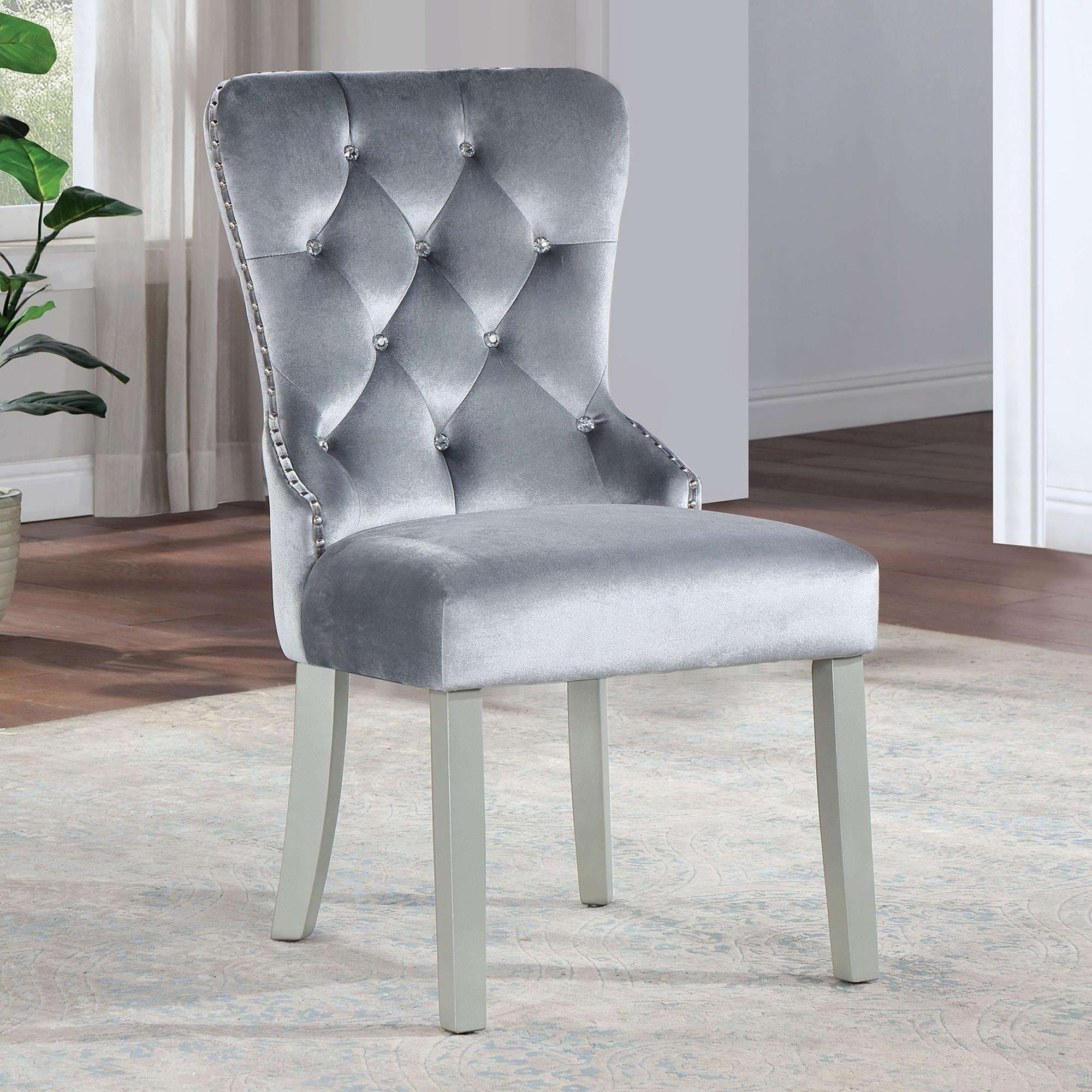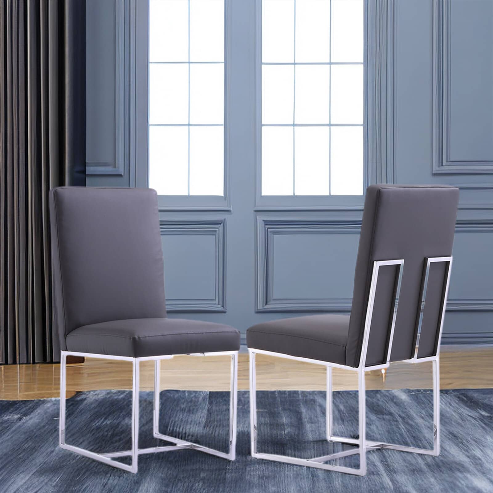 Dining Room Chairs in Grey PU Leather and Mirrored Silver Metal Legs
