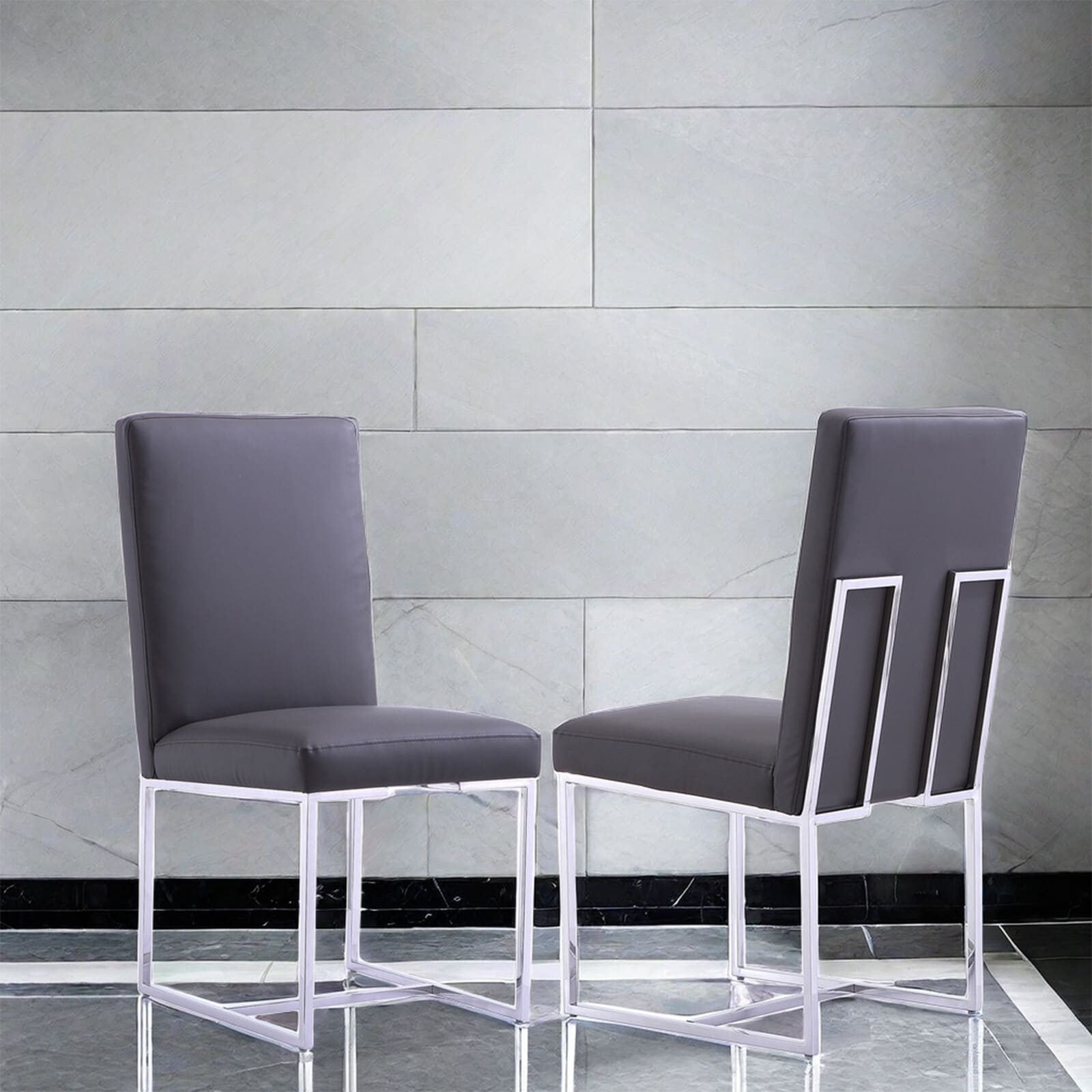 Grey Leather Upholstered Dining Chairs with Silver Stainless Steel Legs Set of 2