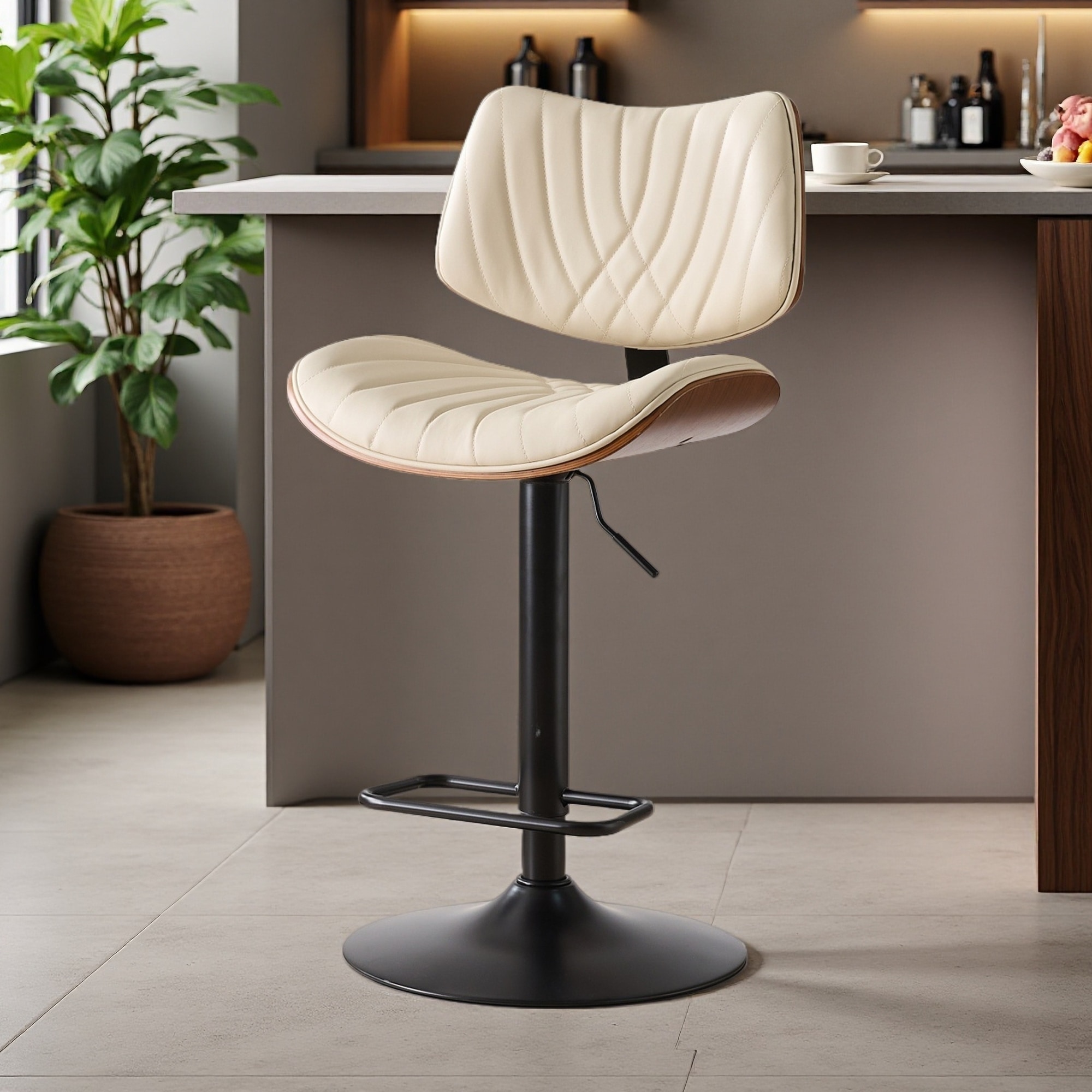 46.2"H Mid-Century Walnut Bentwood Adjustable Bar Stool with Faux Leather Seat