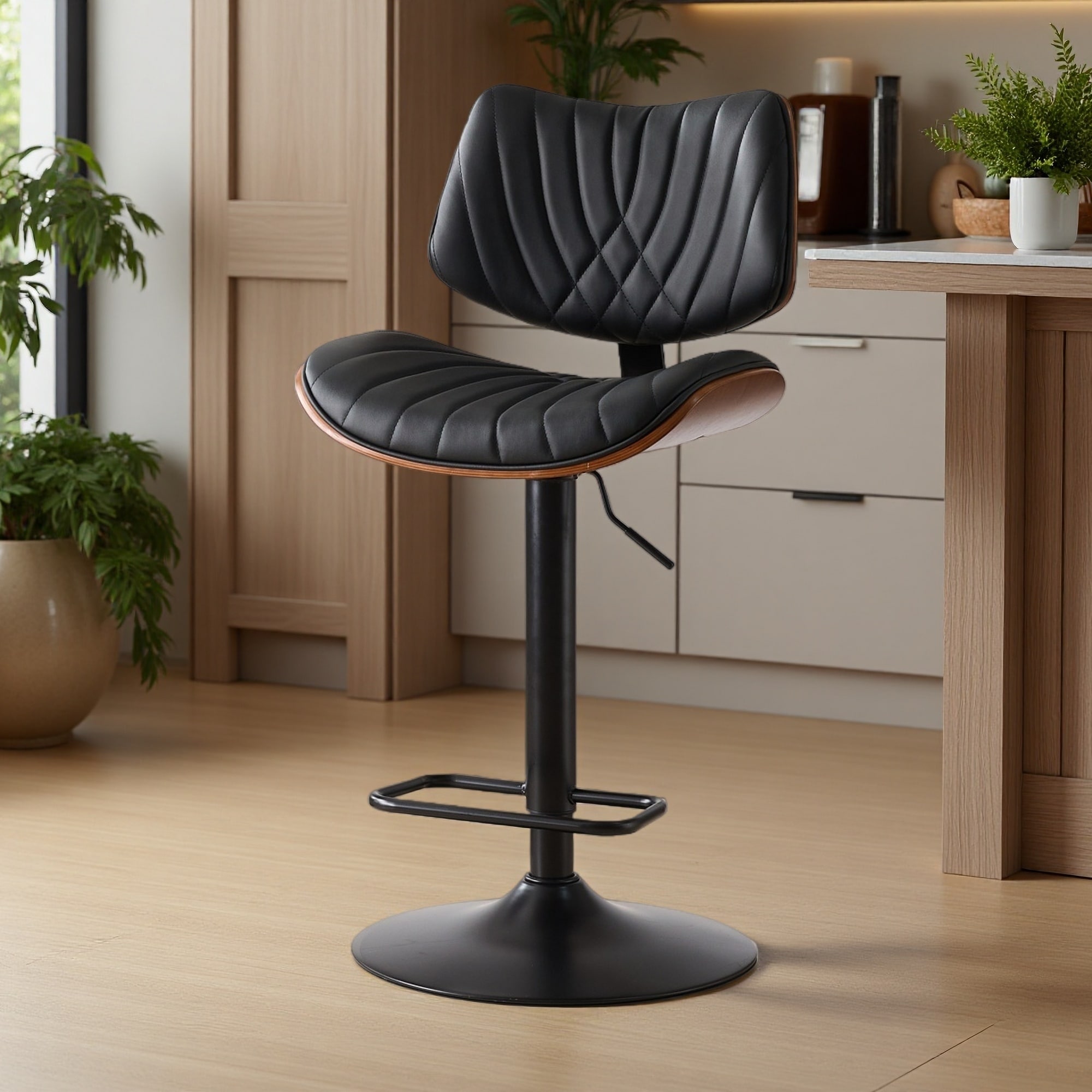 46.2"H Mid-Century Walnut Bentwood Adjustable Bar Stool with Faux Leather Seat