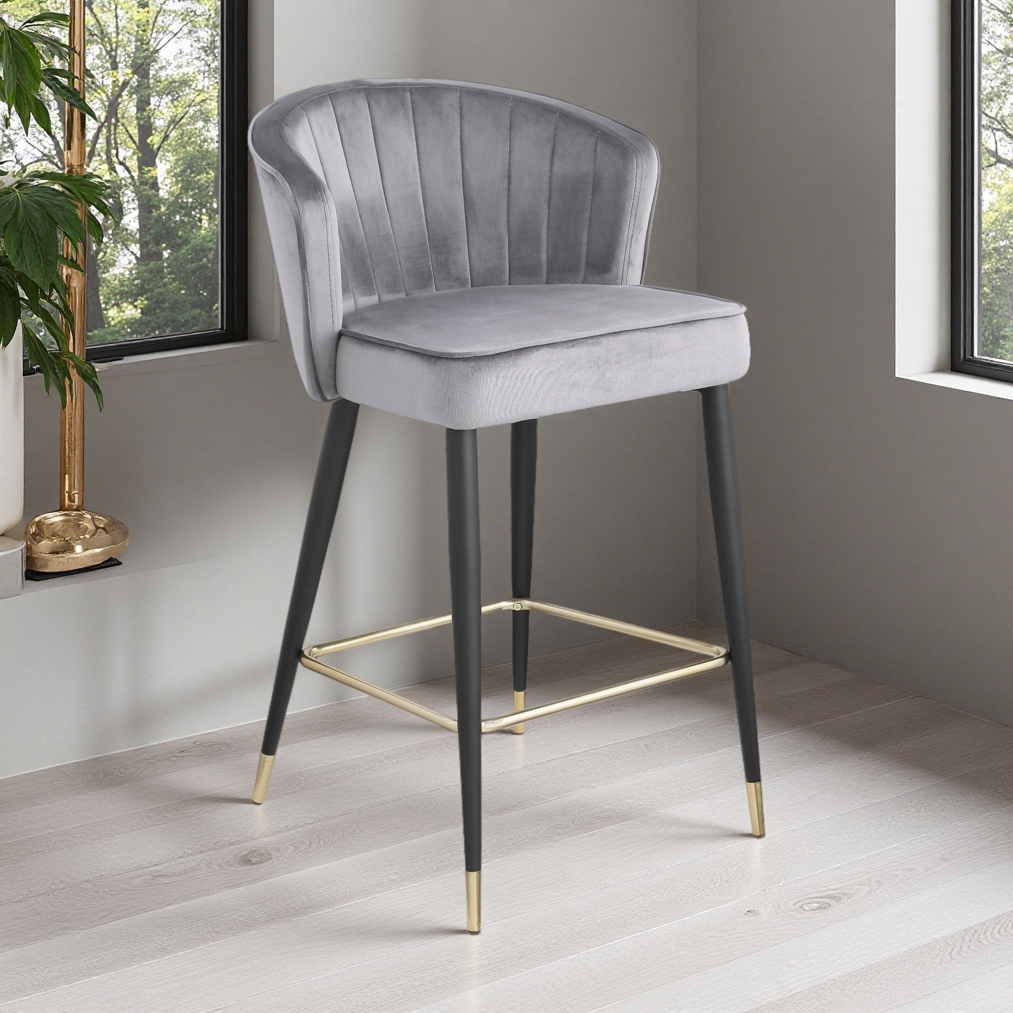 37"H Velvet Upholstered Counter Height Stool with Deep Channel Tufting and Gold-Tipped Black Metal Legs - Contemporary Style