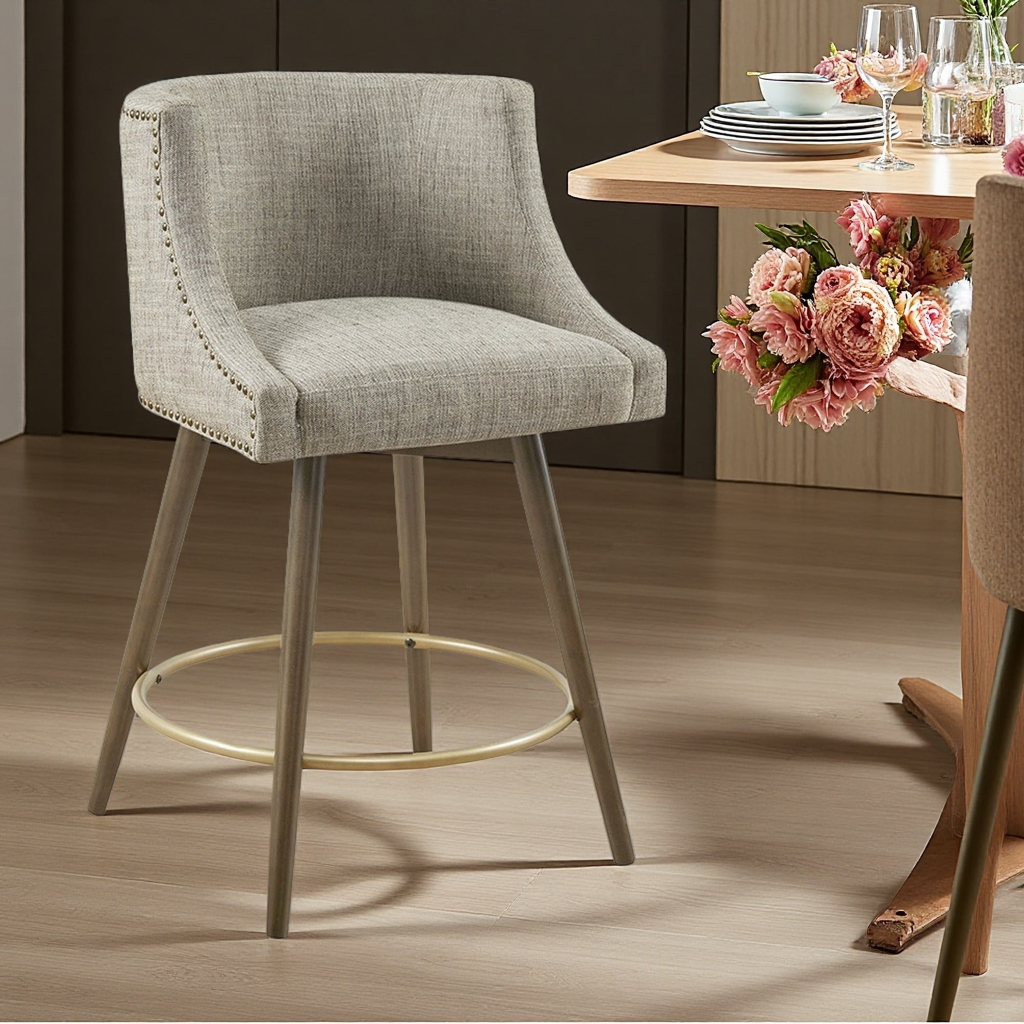36.5"H Solid Wood Tweed Upholstered 360° Swivel Counter Stool with Low Back, Antique Nailhead Trim and Metal Footrest Ring