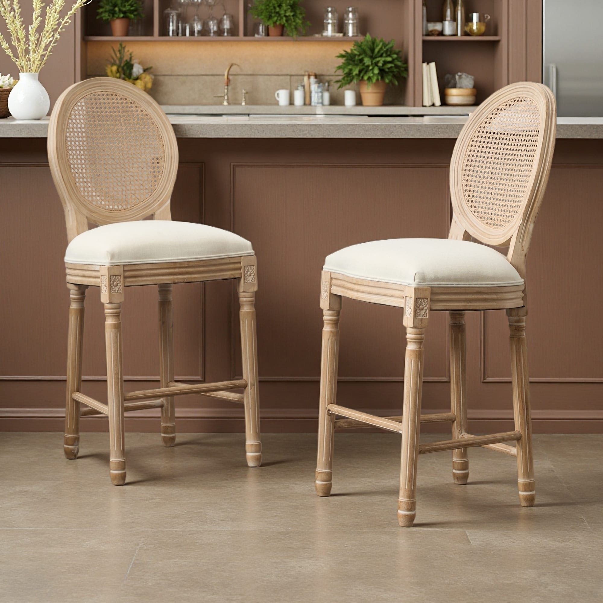 42.5"H Set of 2 Solid Wood Rattan Bar Stools with Upholstered Seat & Adjustable Foot Pads French Country Style Counter Chairs