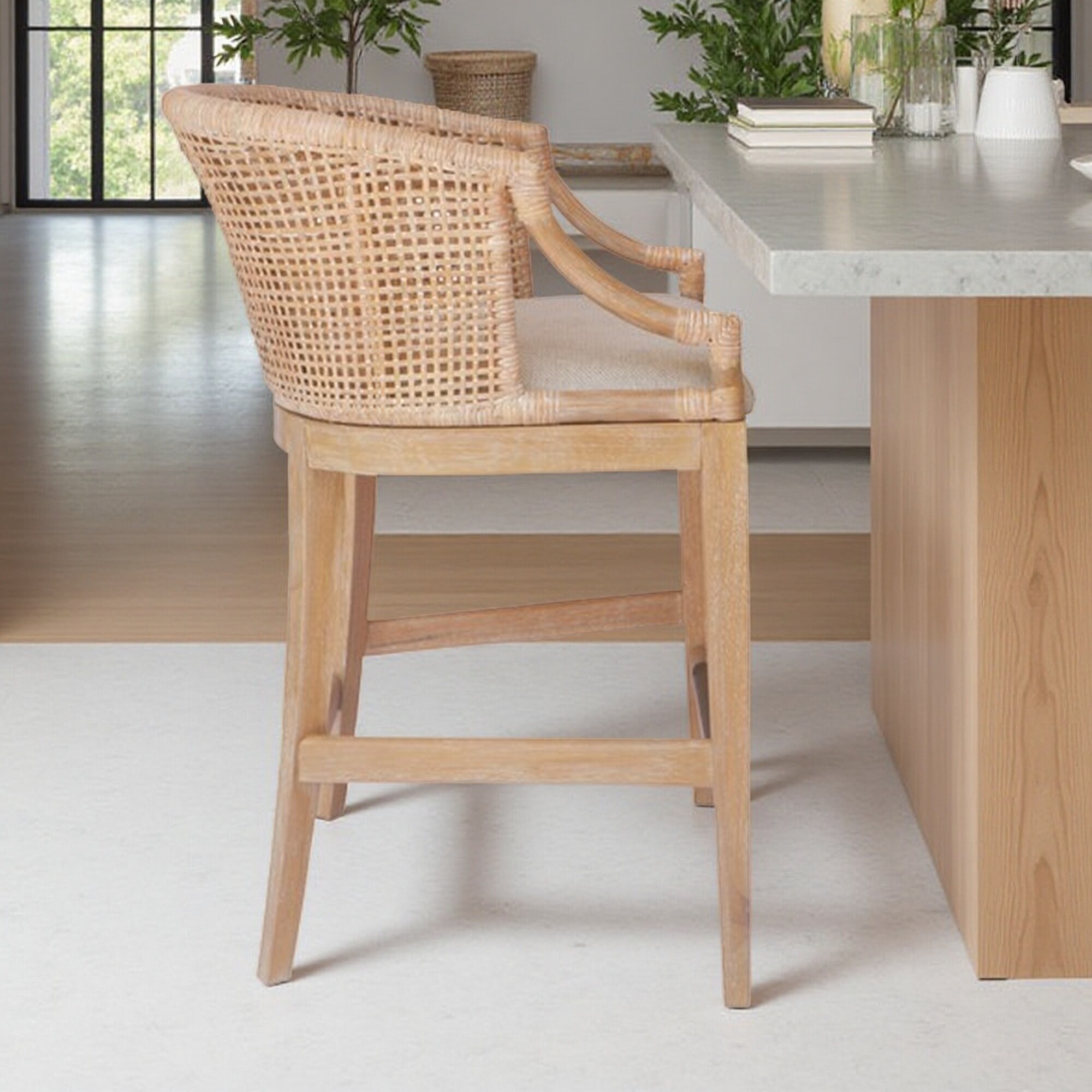 35"H Handcrafted Rattan Counter Stool with Linen Upholstery, Solid Wood Legs, and Antique Bronze Kick Plate