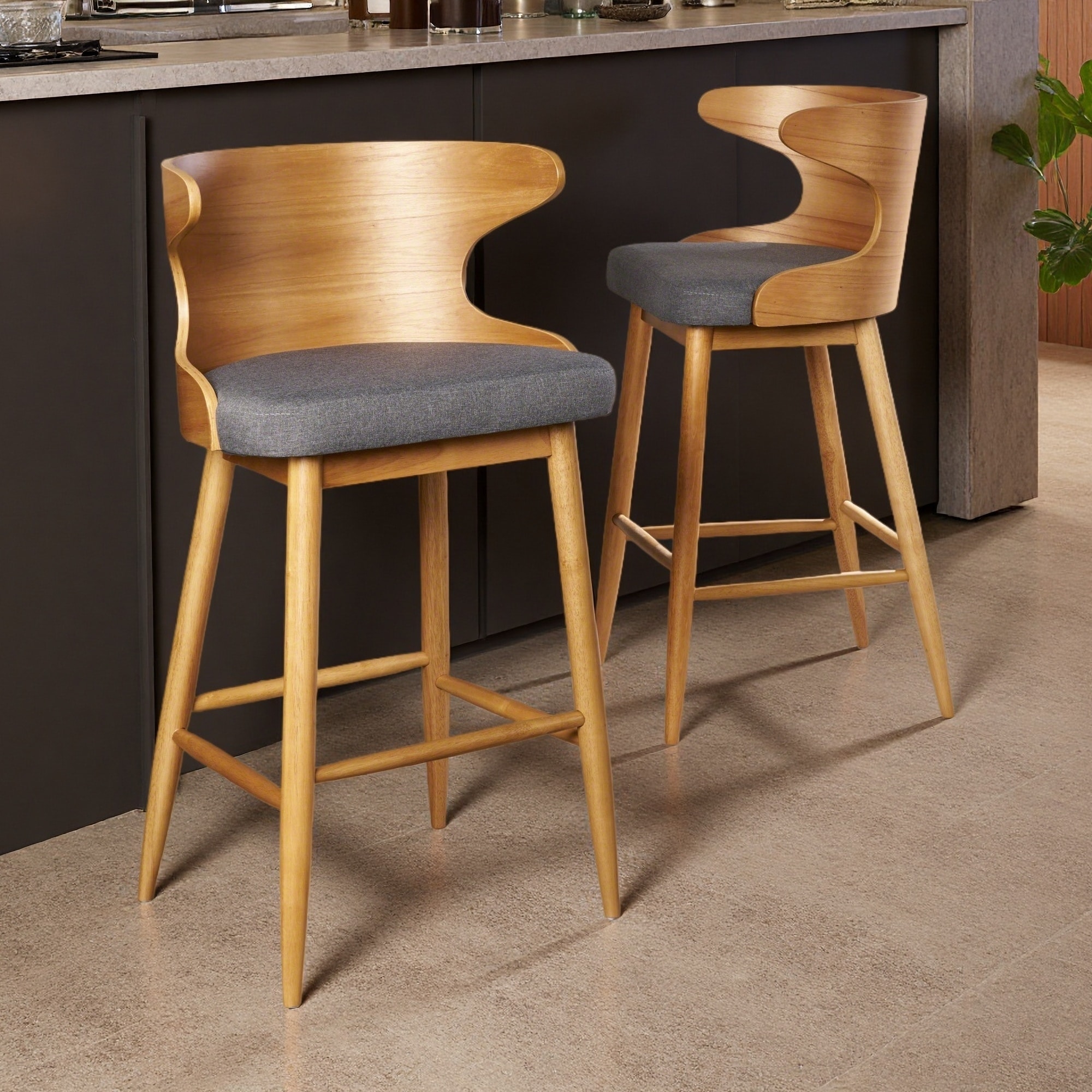 41"H Set of 2 Mid-Century Upholstered Bar Stools with Rubberwood Frame