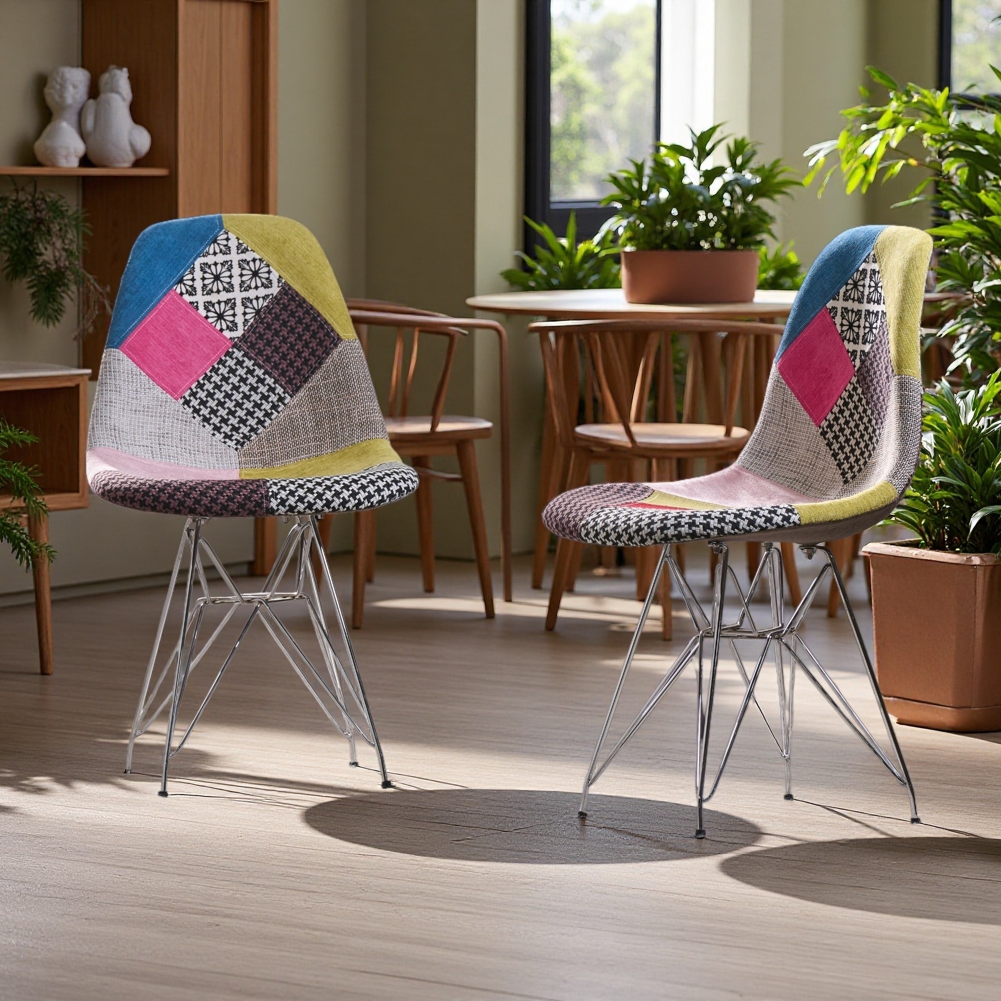 32"H Set of 2 Fabric Patchwork Accent Chair with Chrome Legs & Curved Back -Bohemian Geometric Style