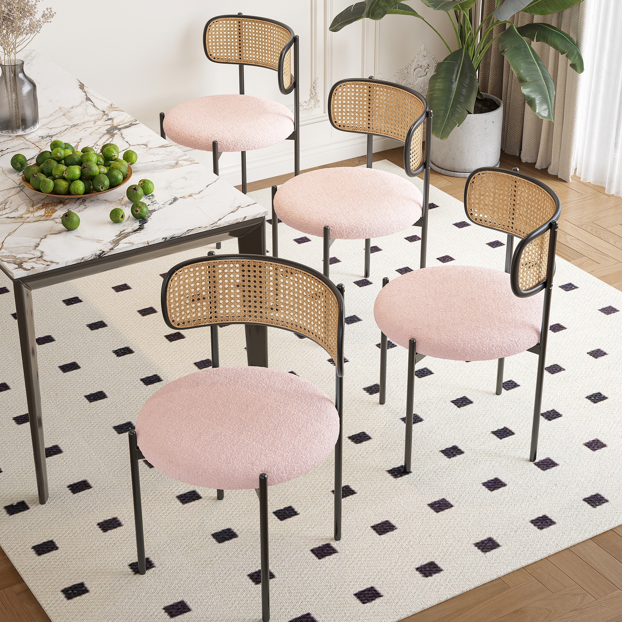 Modern Upholstered Dining Chairs Set of 4,Rattan Back Dining Room Chairs,Accent Kitchen Chairs with Metal Legs,Pink