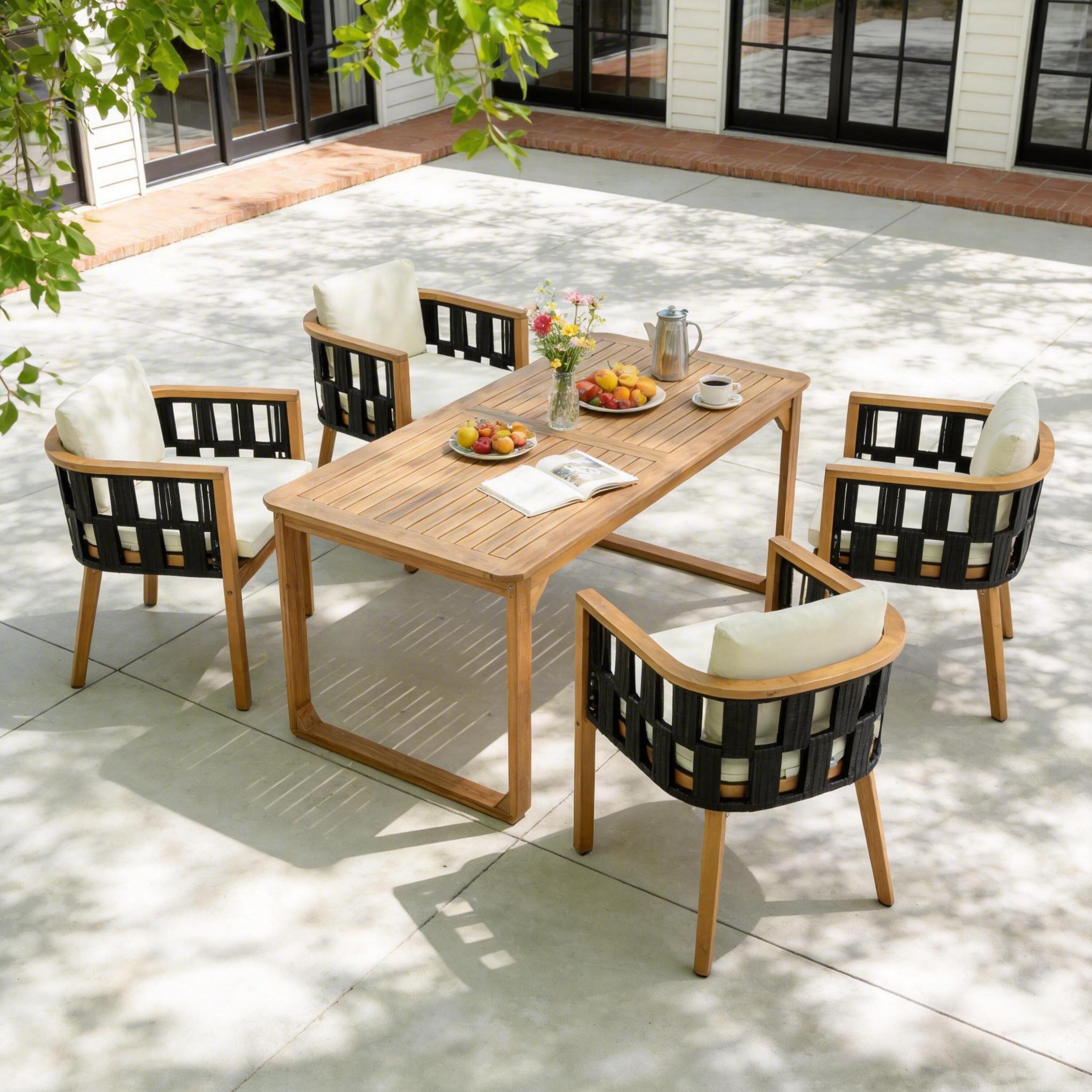 Christopher Knight Home - Ronan Outdoor Acacia Wood Dining Set with Flat Rope Chairs & Curved Leg Dining Table, Teak Finish