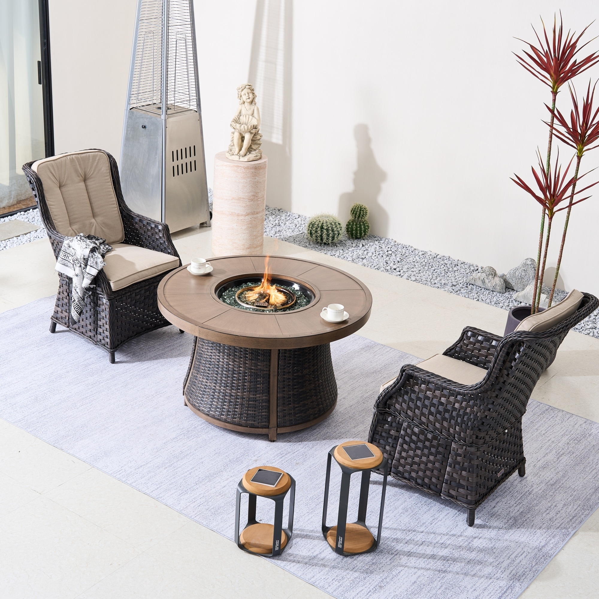 3-Piece Patio Dining Set with Round Fire Pit Table and Two PE Rattan Chairs
