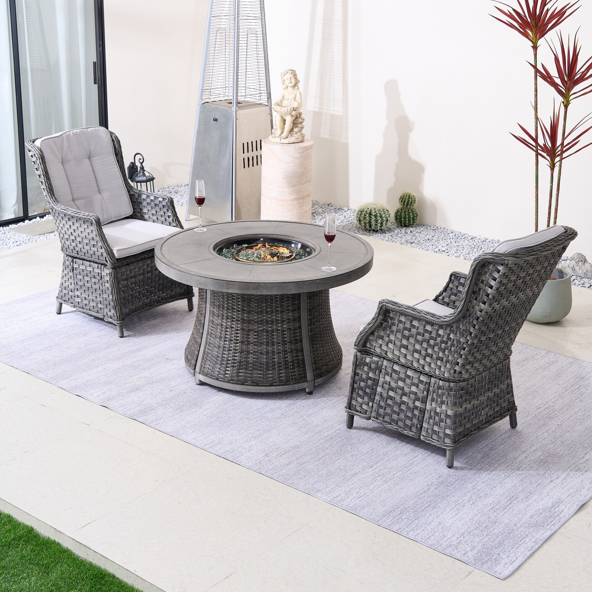 3-Piece Patio Dining Set with Round Fire Pit Table and Two PE Rattan Chairs