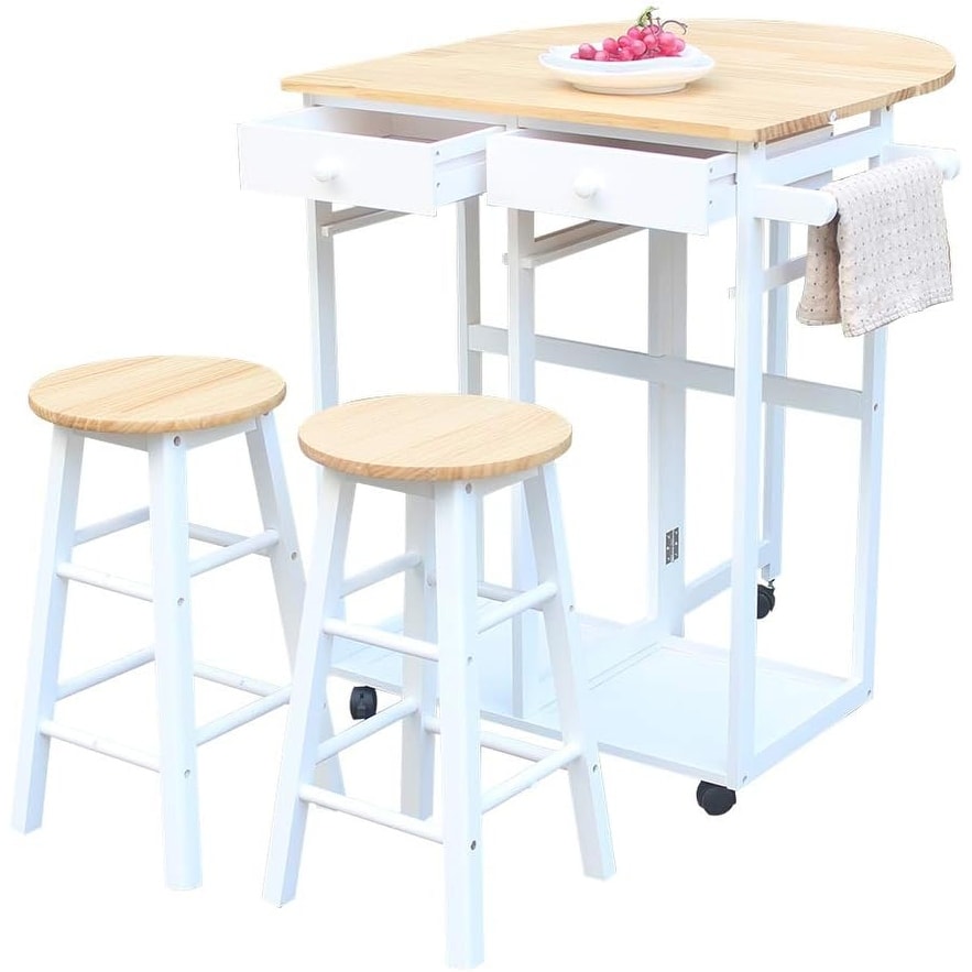 Folding Drop Leaf Dining Table Set with 2 Stools & Drawers, Solid Wood Kitchen Cart on Wheels