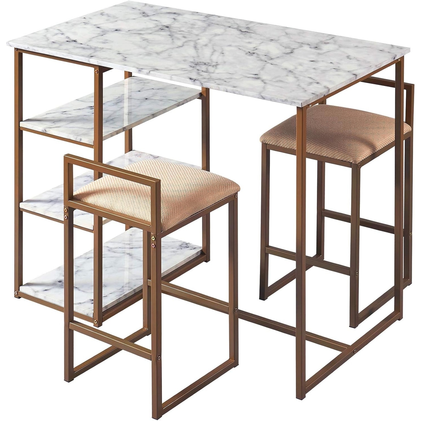 Modern Marble-Look Breakfast Table Set with 2 Stools and Storage, 36 inch Height