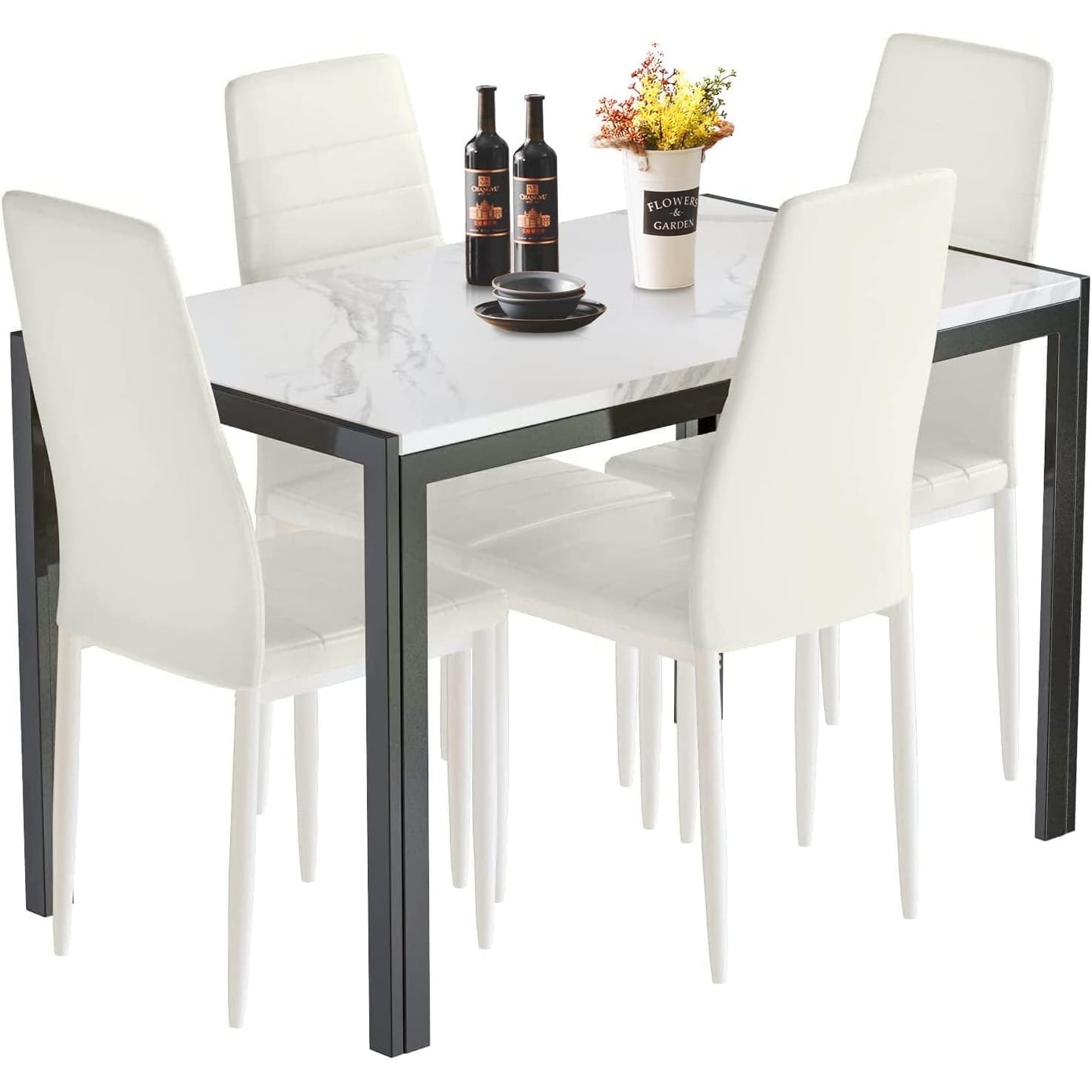 5-Piece Faux Marble Dining Table Set with 4 PU Leather Chairs, Space-Saving Design for Kitchen, Living Room, or Dining Room