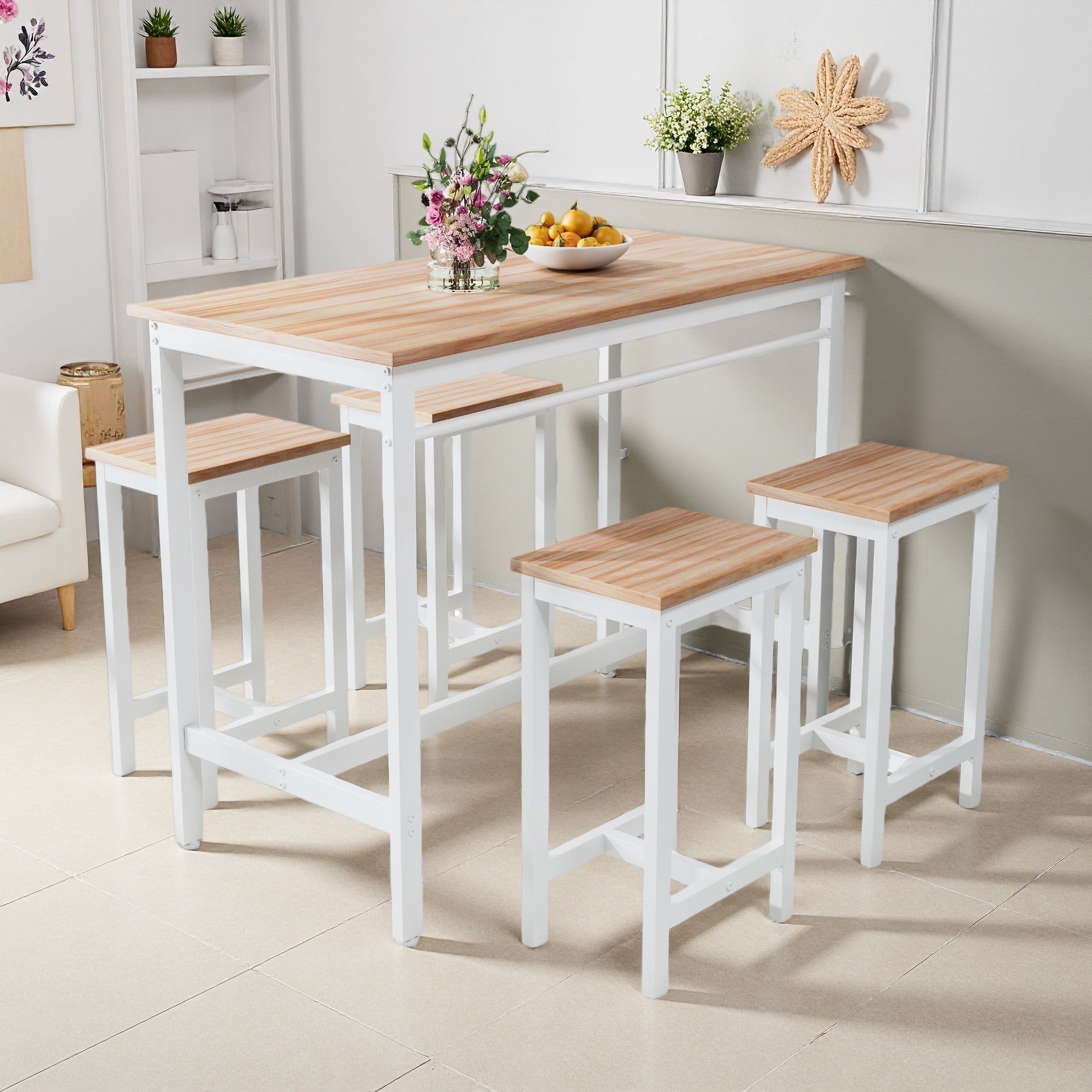 Set of 5 Modern Kitchen Table Set, Oak & MDF, Metal Frame, Space-Saving Bar Table with 4 Stools