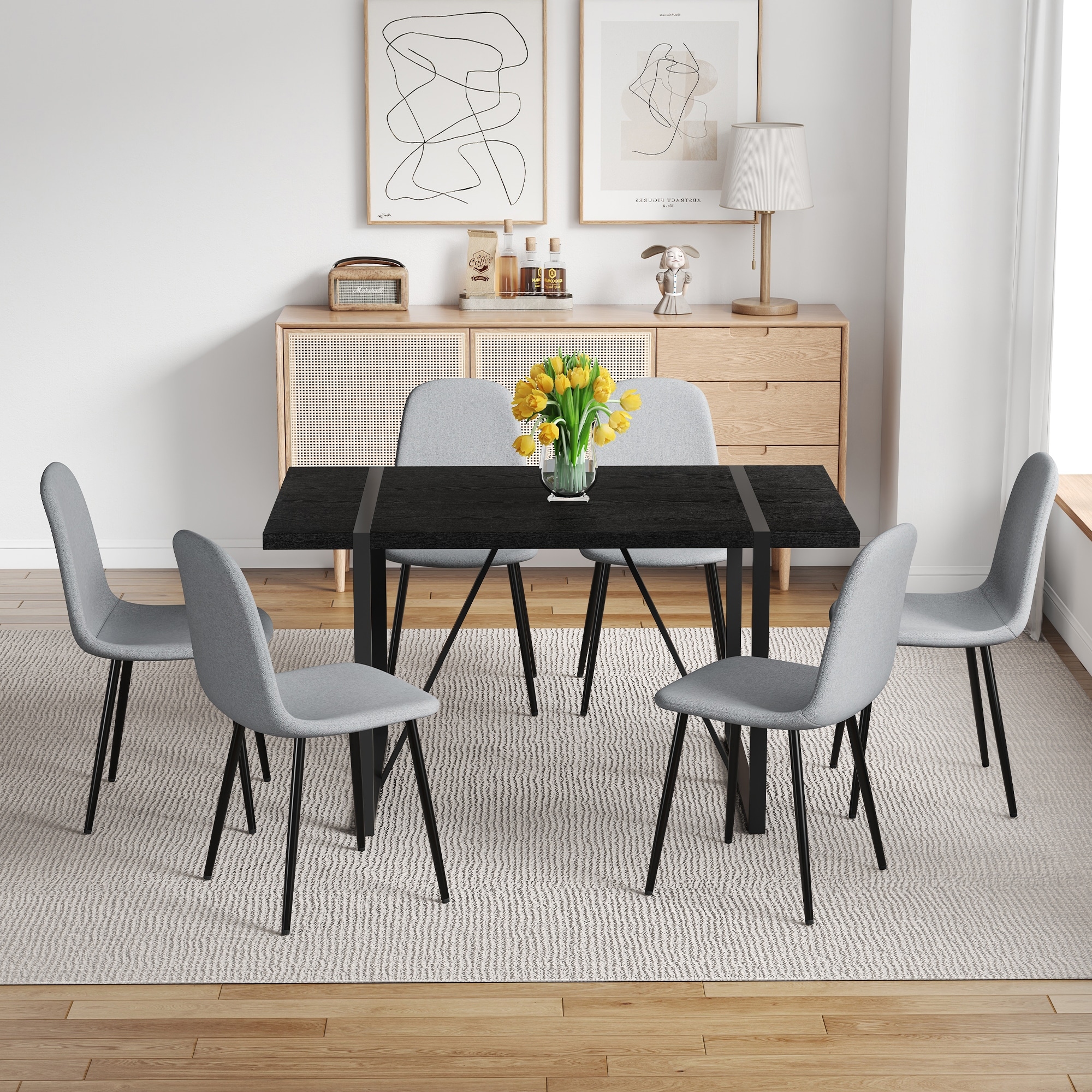 55-Inch Retro Rectangular Dining Table and Chair Set with Textured Tabletop, Includes 6 Linen-Cotton Dining Chairs