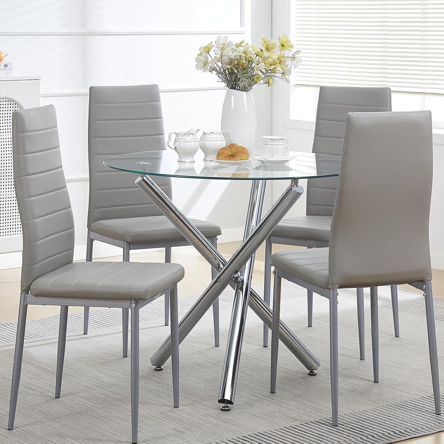 Modern Round Glass Dining Table Set for 4 with Faux Leather Chairs, Compact and Easy to Assemble