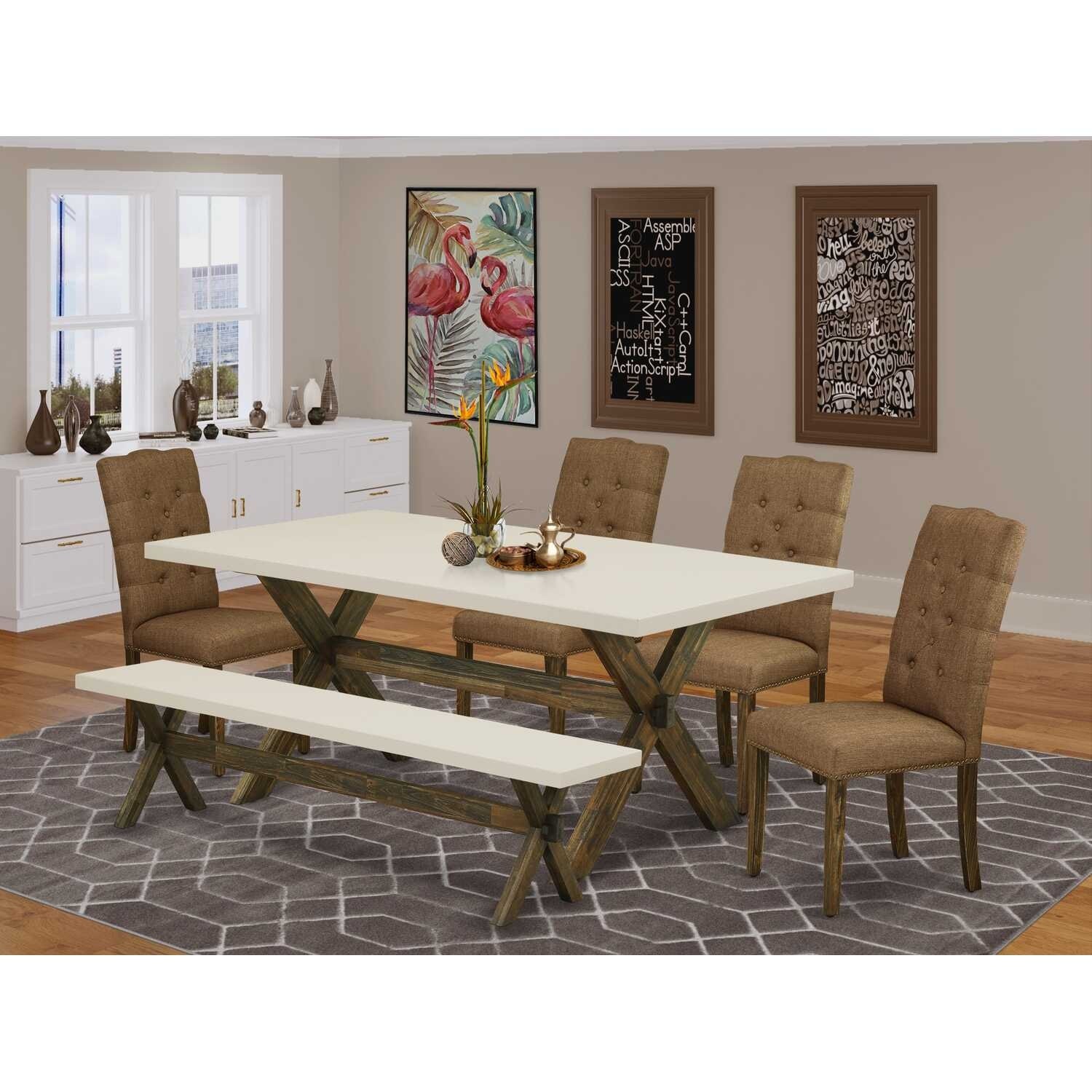 Modern 6-Piece Dinette Set - Kitchen Table with 4 Chairs & Bench - Linen Fabric & Tufted Back
